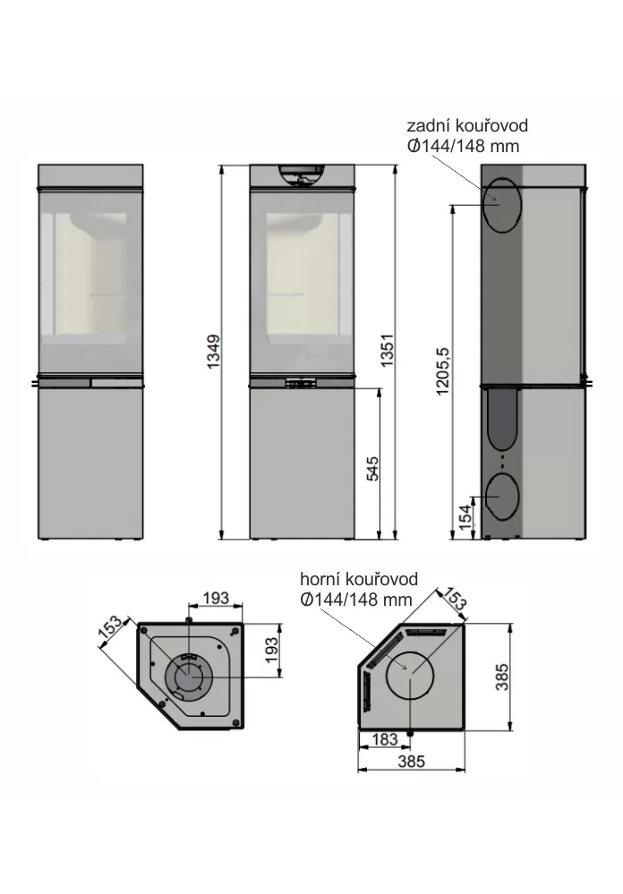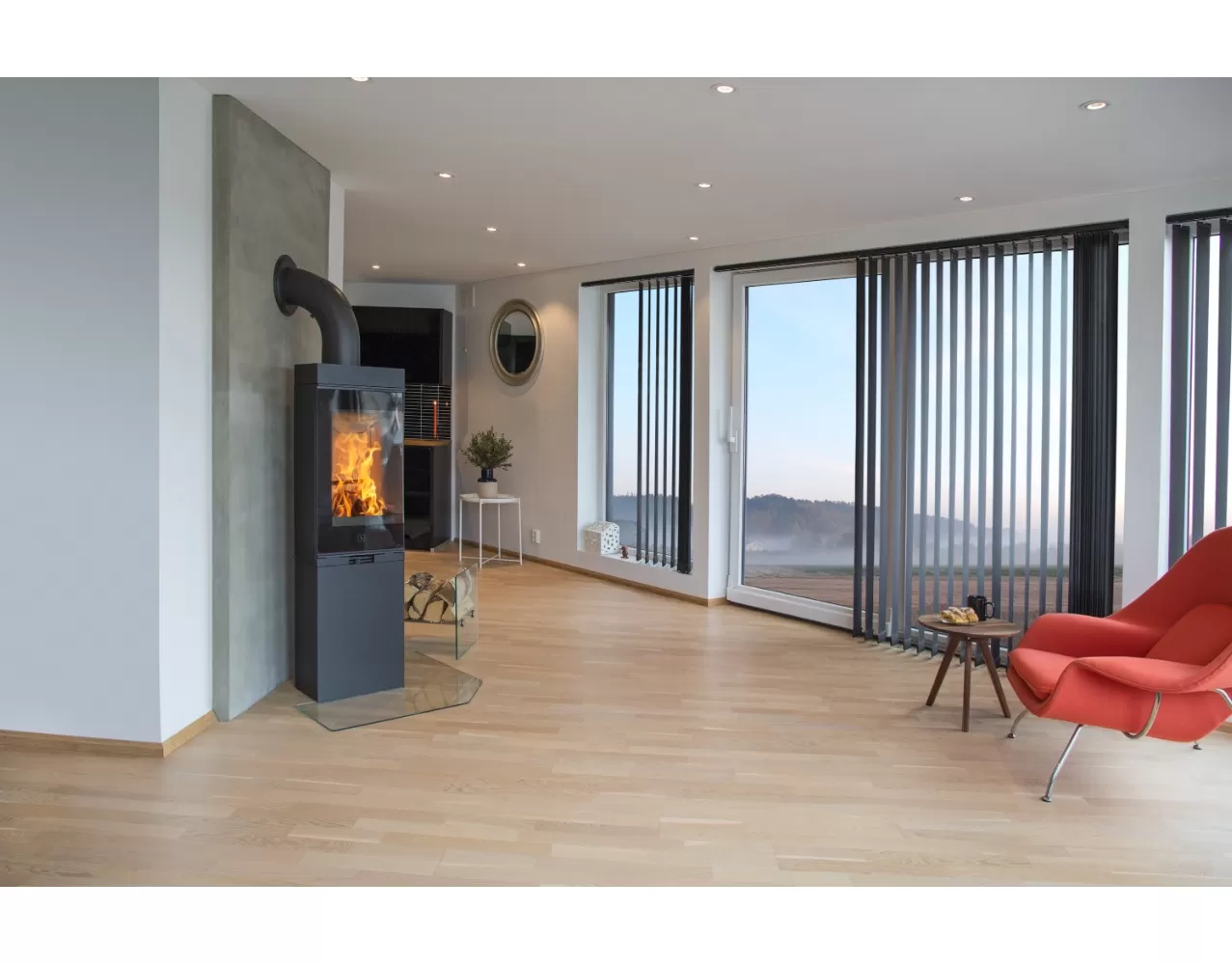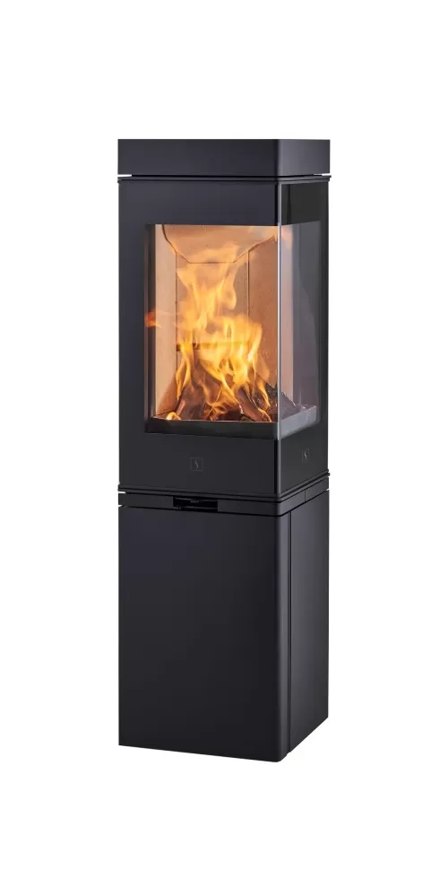 Dvouplášťová konvekční ocelová kamna v elegantním hranatém provedení s rohovým prosklením dvířek. Podstavec je otvírací a prostor je vhodný k uložení dřeva.
