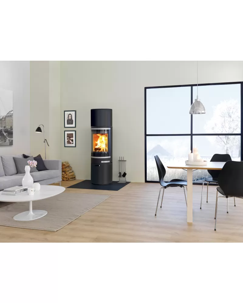 • Scan 85 High Top jsou kamna s horním nástavcem a nízko posazeným topeništěm. Model lze instalovat s akumulačními prstenci, které prodlužují dobu temperování až o 12 hodin po posledním přiložení.