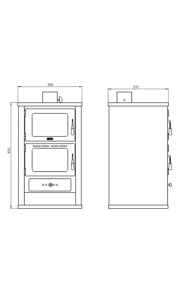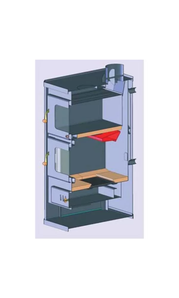 • Jedná se o dvouplášťová ocelová kamna, použitý materiál je plech o síle 3 mm, ohniště je vyloženo šamotem, rošt je litinový.