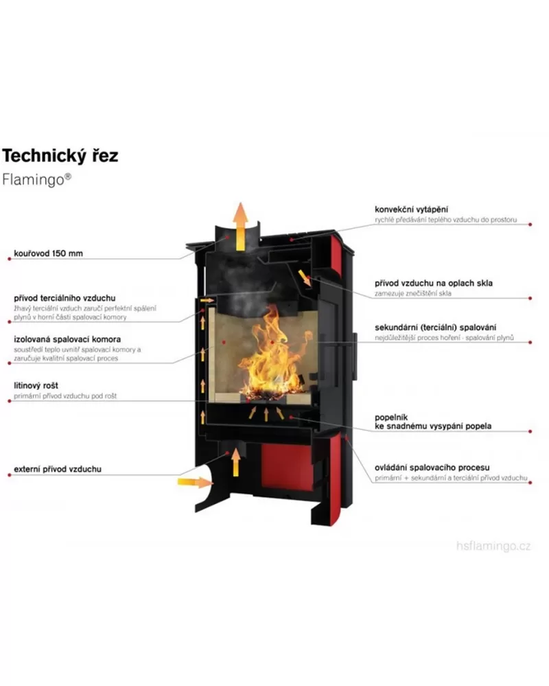 • Sekundární spalování, krásně čisté sklo a externí přívod vzduchu je u kamen Flamingo samozřejmostí.