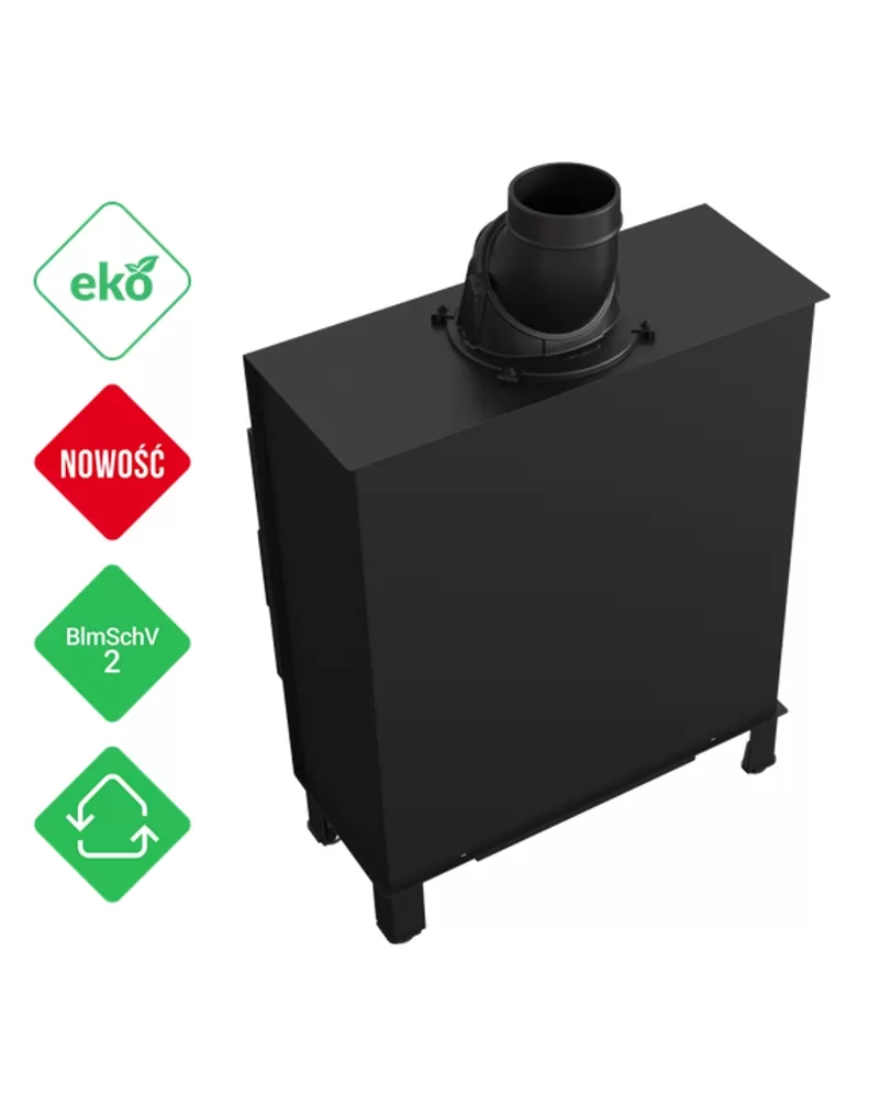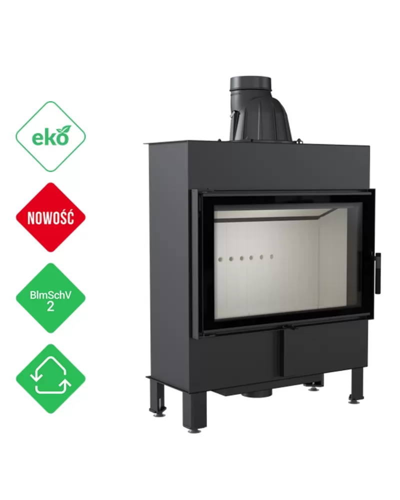 • Topeniště je s roštem a vyjímatelným popelníkem, jako hrdlo kouřovodu je otočná litinová kopule (stavitelná v rozsahu 0-360°, je možné ji nahradit adaptérem na teplovodní výměník či akumulační kroužky), sklo dvířek topeniště je designové, s černým lemem, zakrývajícím profil dvířek