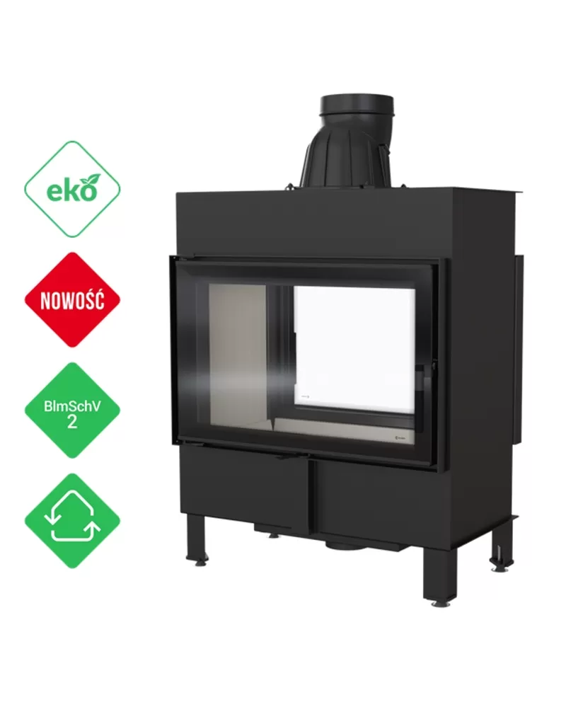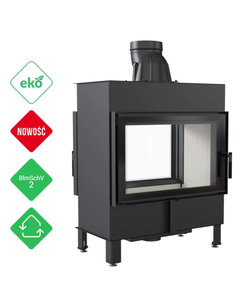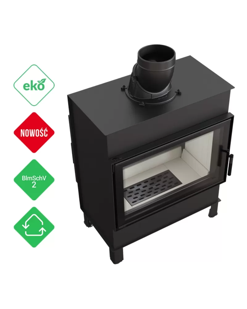 • Topeniště je s roštem a vyjímatelným popelníkem, jako hrdlo kouřovodu je otočná litinová kopule (stavitelná v rozsahu 0-360°, je možné ji nahradit adaptérem na teplovodní výměník či akumulační kroužky), sklo dvířek topeniště je designové, s černým lemem, zakrývajícím profil dvířek