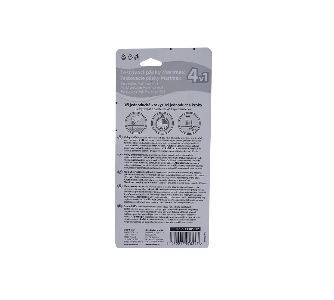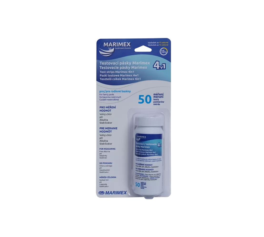 Proužkový tester Marimex 4v1 pro rodinné bazény umožňuje 50 měření, přičemž jednoduše a rychle měří hodnoty volného chlórupHcelkové alkality a stability vody v bazénech či vířivkách.