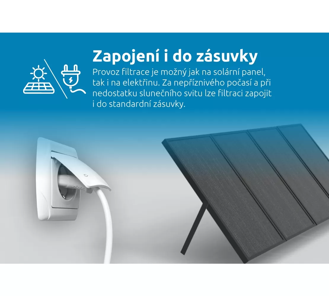 Základní chod filtrace ProStar Solar 3 zajišťuje solární panel. Za nepříznivého počasí lze filtraci zapojit i do zásuvky.