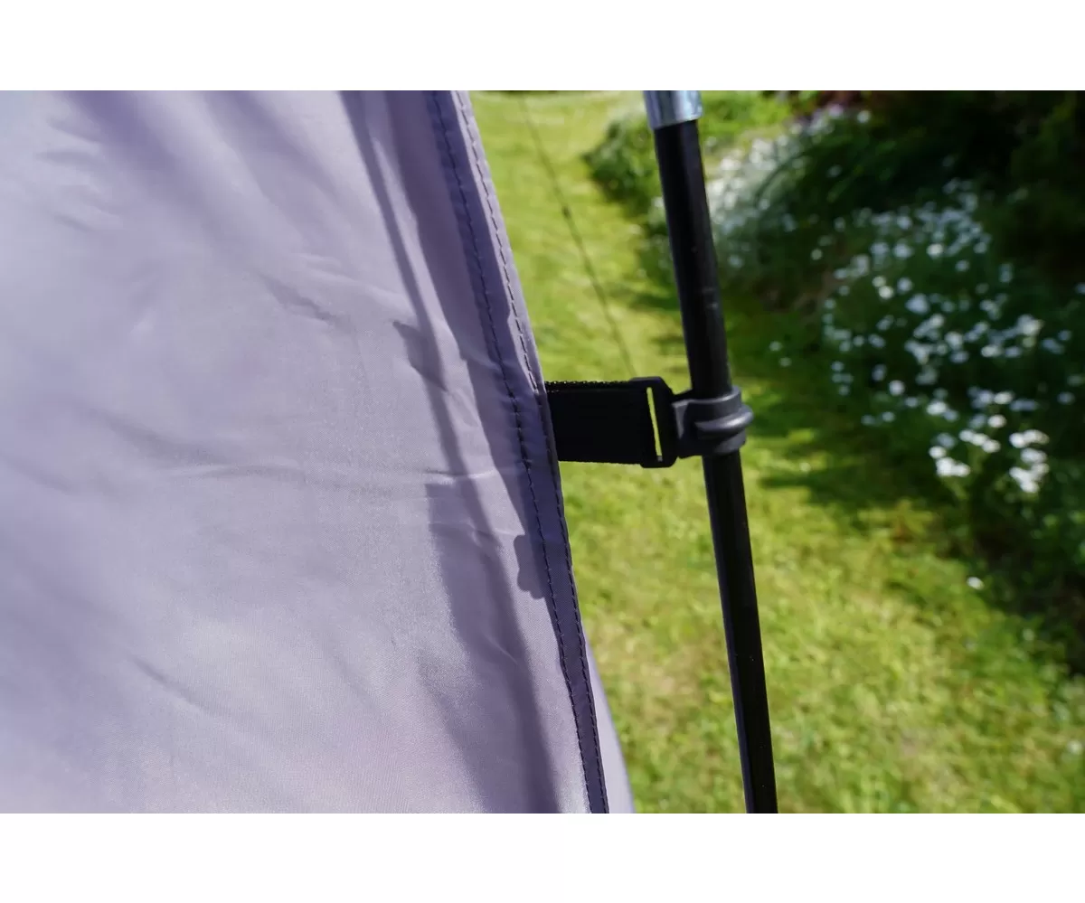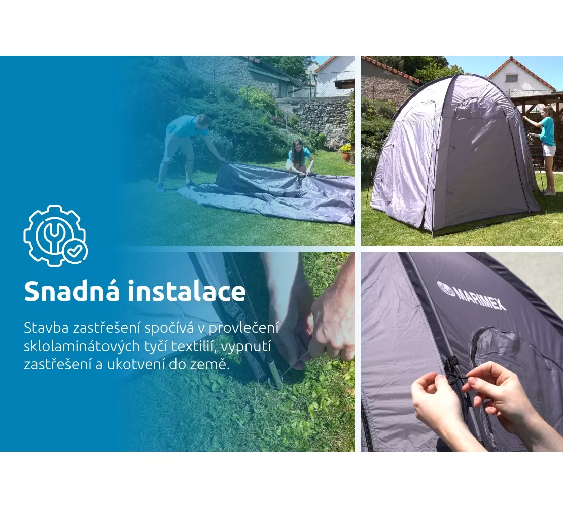 Stavba a manipulace se zastřešením je velmi snadná. Stačí vypnout stěny zastřešení pomocí tyček a upevnit do země kotvami. Princip instalace je podobný jako u běžného tyčkového stanu. Stěny zastřešení se otevírají pomocí zipu a upínají se prostřednictvím knoflíků po stranách. Dvoje protilehlé dveře lze kompletně otevřít a utvořit tak průchody.
