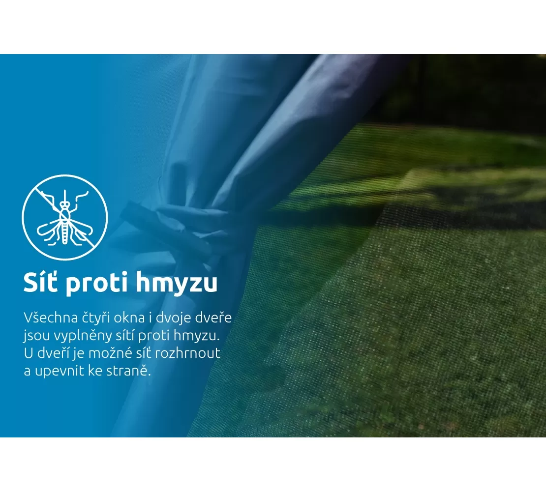 Moskytiéra proti hmyzuVšech 6 stran stanu lze zcela uzavřít nebo ponechat moskytiéru. |