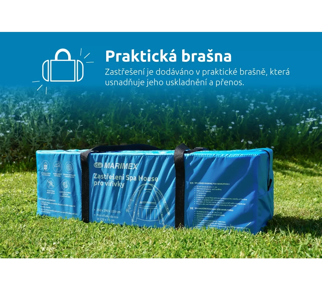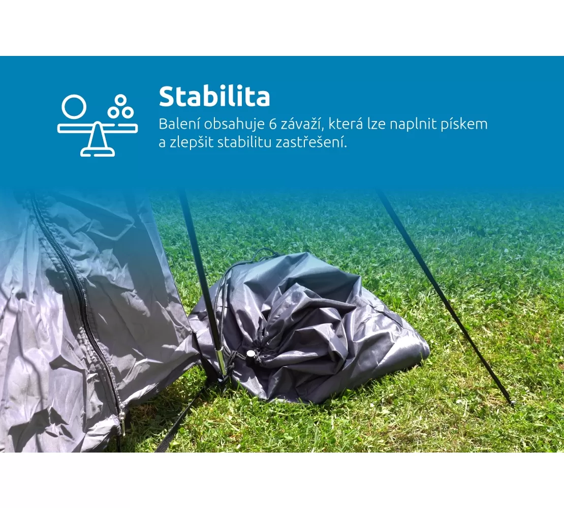 Zastřešení je dodáváno v praktické brašně, která usnadňuje jeho uskladnění a díky dvěma pevným popruhům i přenos. Po složení lze zastřešení opětovně uložit do brašny. Navíc je v balení 6 sáčků, které je možné naplnit pískem a podpořit ukotvení zastřešení. Závaží se uvazují na nohy zastřešení a tím zvyšují jeho stabilitu.