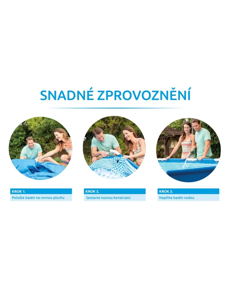 • Stačí jen připravit místo na bazén, rozvinout bazénovou podložku, bazén rozbalit, sestavit podpěrnou konstrukci, na kterou se navlékne bazénová folie
