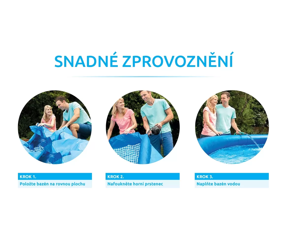 Bazén Tampa se řadí mezi neprodávanější a nejoblíbenější bazény v České republice. Koupání ve vlastním bazénu si může dopřát opravdu každý. Předností bazénu Tampa je nízká cena, snadná údržba i rychlé zprovoznění. Stačí jen připravit místo na bazén, rozvinout bazénovou podložku, bazén rozbalit, nafouknout horní límec a začít napouštět vodu. Stoupající voda sama bazén postaví. Od vybalení bazénu můžete do 10 minut napouštět vodu. Bazén je nutné po skončení bazénové sezony vyčistit, vypustit a uklidit na suché, nemrznoucí místo. Správnou údržbou prodloužíte životnost bazénu. Doporučujeme bazén po koupání zakrývat krycí plachtou. Pro snadné nafouknutí doporučujeme zakoupit ruční či elektrickou pumpu.