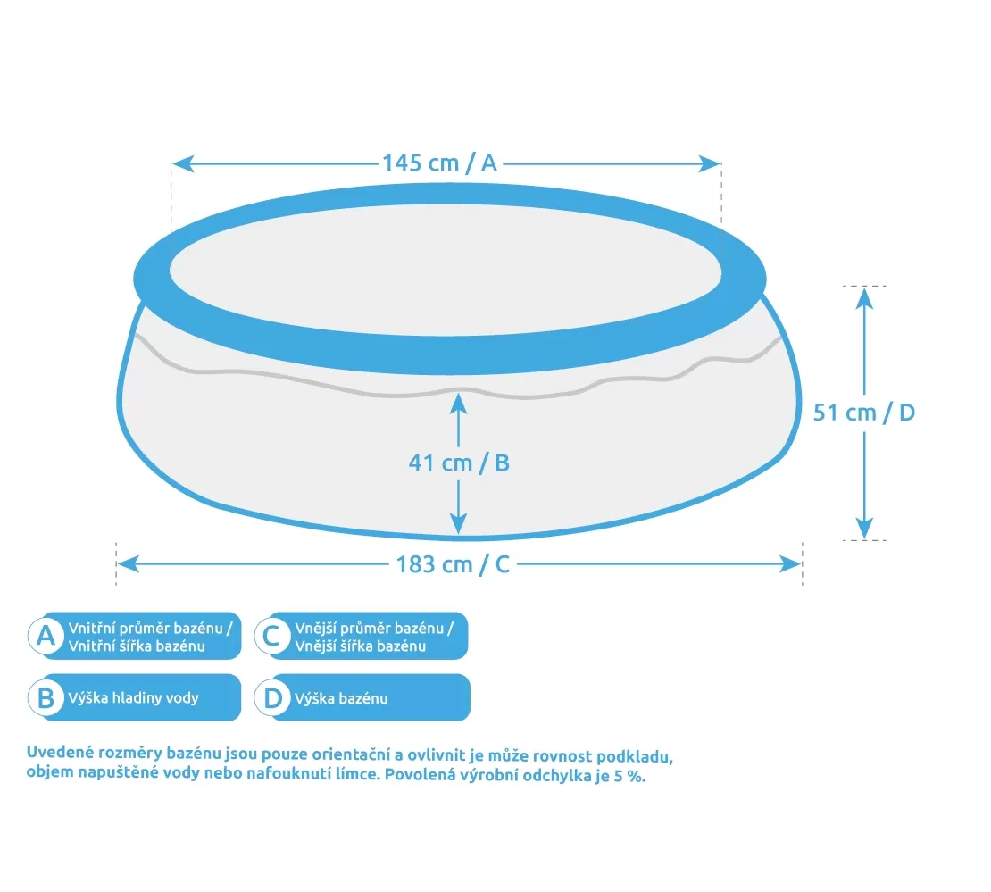 Uvedené rozměry bazénu jsou pouze orientační a ovlivnit je může rovnost podkladu, objem napuštěné vody nebo nafouknutí límce. Povolená výrobní odchylka je 5 %.