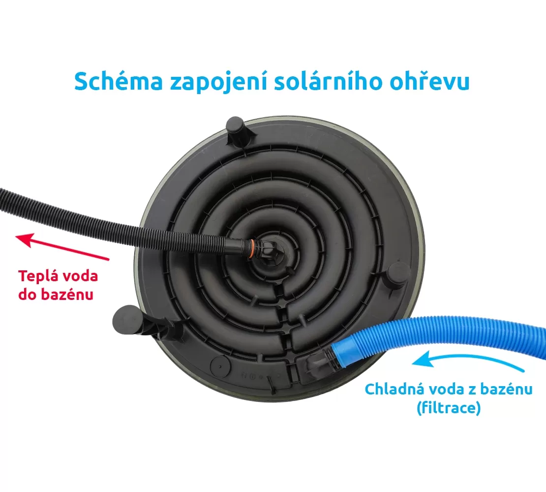 Součástí balení je solární ohřev, vrchní plastový kryt a trny na napojení 32 a 38 mm hadic.
