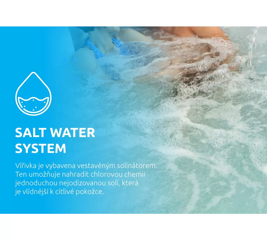 Vířivka je vybavena vestavěným solinátorem, který nahrazuje chlor jednoduchou nejodizovanou solí, která je šetrnější k lidské pokožce.