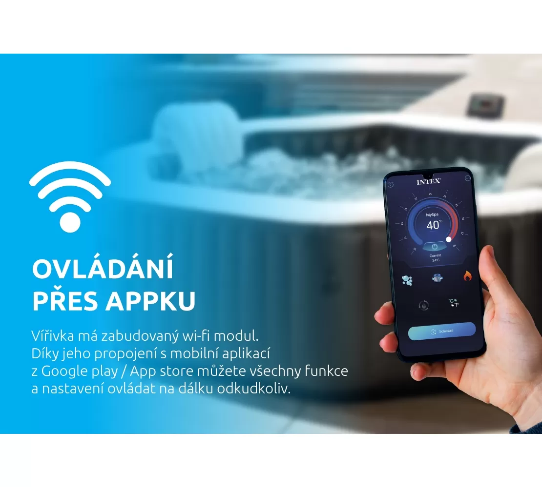 Vířivka má zabudovaný wi-fi modul, díky jeho propojení s mobilní aplikací z Google play / App store si můžete všechny funkce a nastavení ovládat na dálku odkudkoliv. Dokonalou relaxační lázeň tak stihnete připravit ještě před Vaším příchodem.