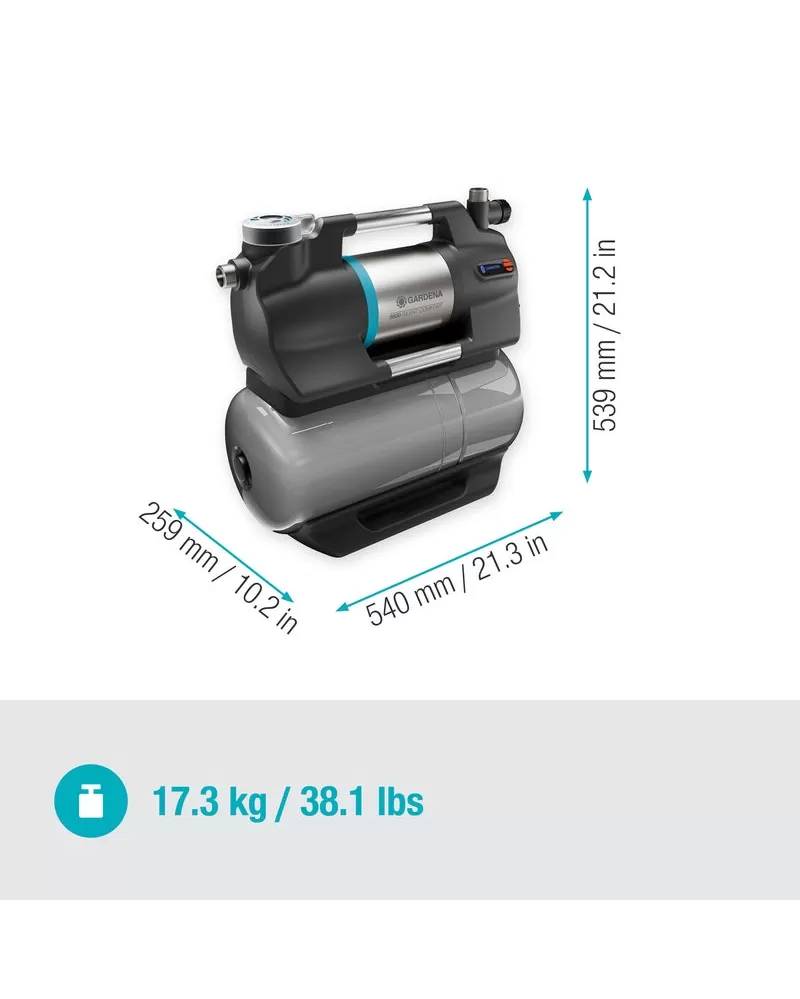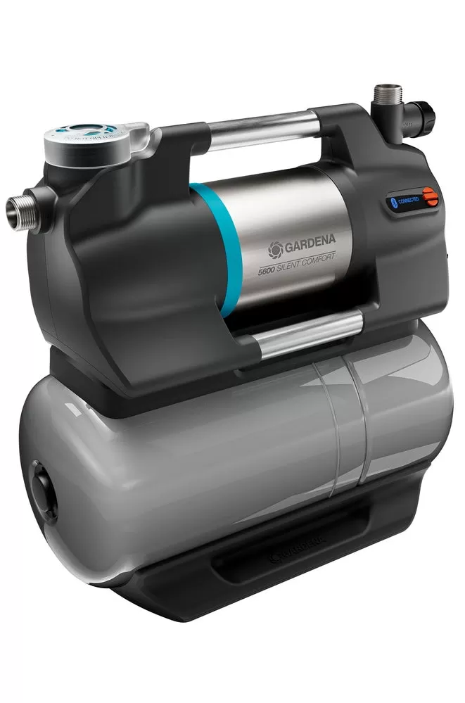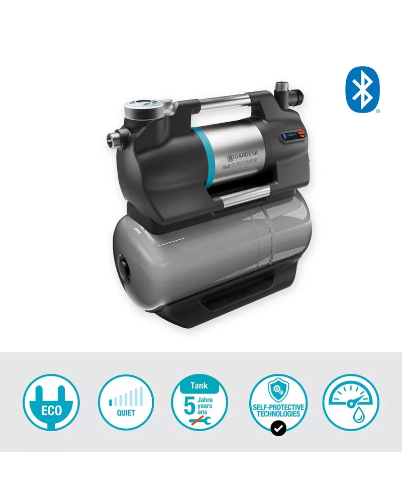 Představujeme čerpadla s neuvěřitelně nízkou hladinou hluku s ovládáním zavlažování přes Bluetooth, která poskytují větší výkon. GARDENA domácí vodárna 5600 SilentComfort vám přináší ideální řešení pro automatizované zásobování vaší domácnosti a zahrady vodou. Domácí vodárna je extrémně výkonná s dopravní výškou 47 m (4,7 bar) a průtokem 5600 litrů za hodinu. Vysoká účinnost této Booster sady je demonstrována skromnou spotřebou energie pouhých 900 wattů. Dokáže čerpat vodu z hloubky až 8 metrů. Vodárnu lze použít pro automatickou bezplatnou distribuci užitkové vody z dešťového sudu, studny nebo jímky do domu a na zahradu pro použití v domácnosti, jako je např. splachování toalety nebo přívod vody do pračky. Domácí vodárna se automaticky zapne v závislosti na potřebě vody a poté se opět vypne. Vzhledem k tomu, že má k dispozici velkou 25litrovou akumulační nádrž, funguje extrémně tiše a hospodárně. Domácí vodárna SilentComfort, vyvinutá v Německu, je výjimečně tichá s výkonem pouze XX dB(A) akustického tlaku na vzdálenost 5 metrů. Tato nízká hlučnost je možná díky inovativní, vodou chlazené vícestupňové technologii, která nepotřebuje ventilátor, protože chlazení probíhá vodou, což zajišťuje maximální účinnost a minimální hluk. Kromě vytvoření plánu zavlažování můžete pomocí podsvíceného LCD displeje na zařízení nastavit další užitečné funkce a vodárnu spustit nebo zastavit. Jako praktickou alternativu k ručnímu ovládání můžete čerpadlo ovládat přes Bluetooth pomocí smart telefonu nebo tabletu až ze vzdálenosti 10 metrů pomocí aplikace GARDENA Bluetooth. Jednoduše získáte přístup k doplňkovým funkcím, jako je vytváření plánů zavlažování, i když nejste doma, nastavení časovače, sledování aktuálního tlaku nebo přizpůsobení zapínacího a vypínacího tlaku vašim individuálním potřebám. Díky možnosti připojení čidla půdní vlhkosti GARDENA je zaručena ideální dodávka vody pro vaše rostliny během předem naprogramovaných plánů a zabrání se plýtvání vodou, protože pokud je půda již příliš mokrá, plány zavlažování se nebudou realizovat. Uvnitř 25litrového tanku je vysoce výkonná membrána, což znamená, že nádrž bude bezúdržbová po dobu nejméně pěti let. Není třeba doplňovat vzduch ani vyměňovat membránu v nádrži. Vnitřní membrána nádrže je vyrobena z voděodolné, vícevrstvé vložky, která chrání pouzdro před korozí. Integrovaná spojka mezi čerpadlem a nádrží je vyrobena z nerezové oceli. Díky tomu je čerpadlo nejen mimořádně odolné, ale také dobře chráněné a může být instalováno v kompaktních oblastech. Keramický těsnící systém s dvojitým těsněním, ochrana proti chodu nasucho a přehřátí (voda a motor), spolu s volitelně aktivovatelnou detekcí kapající vody a integrovaným jemným filtrem zajišťují dlouhou životnost. Filtr zabraňuje vnikání nečistot do energeticky úsporného čerpadla nebo jeho příslušenství. Na požádání vám čerpadlo připomene, že máte vyčistit filtr a aplikace vám pomůže s prvním spuštěním s jasnými pokyny krok za krokem dostupnými ve 28 jazycích. Aplikace i displej na krytu zobrazují digitální dotykový displej. Díky vestavěné zpětné klapce je domácí vodárna 5600 SilentComfort připravena k okamžitému použití, jakmile ji vyjmete z krabice. Pokud chcete elektrické čerpadlo používat například k zavlažování zahrady, můžete zvolit funkci Power Boost. Při aktivaci automaticky detekuje zvýšenou potřebu vody a deaktivuje zamýšlený uzavírací tlak zásobníku. Tímto způsobem se využívá maximální tlak čerpací jednotky. Typický problém domácích vodáren s kolísáním tlaku při zavlažování je minulostí a je dosaženo výkonu, na který jste zvyklí z kvalitního zahradního čerpadla. Po zavlažování se čerpadlo automaticky přepne zpět na energeticky úsporný provoz. Odolná domácí vodárna je vyrobena z vysoce kvalitních materiálů, jako je nerezová ocel pro hnací hřídel a přípojky, rovněž pro motor a těleso čerpadla. Jeden ze dvou vývodů lze otočit o 180°. Díky velkému plnicímu otvoru a samostatné vypouštěcí zátce se domácí vodárna zvlášť snadno plní nebo vypouští kvůli ochraně před mrazem. GARDENA vám po online registraci nabízí na domácí vodárnu 5600 SilentComfort záruku v trvání pěti let. Pociťte sílu čerpadel GARDENA. Více než 40 let zkušeností v oblasti použití v domácnosti, zavlažování a odvodňování.
