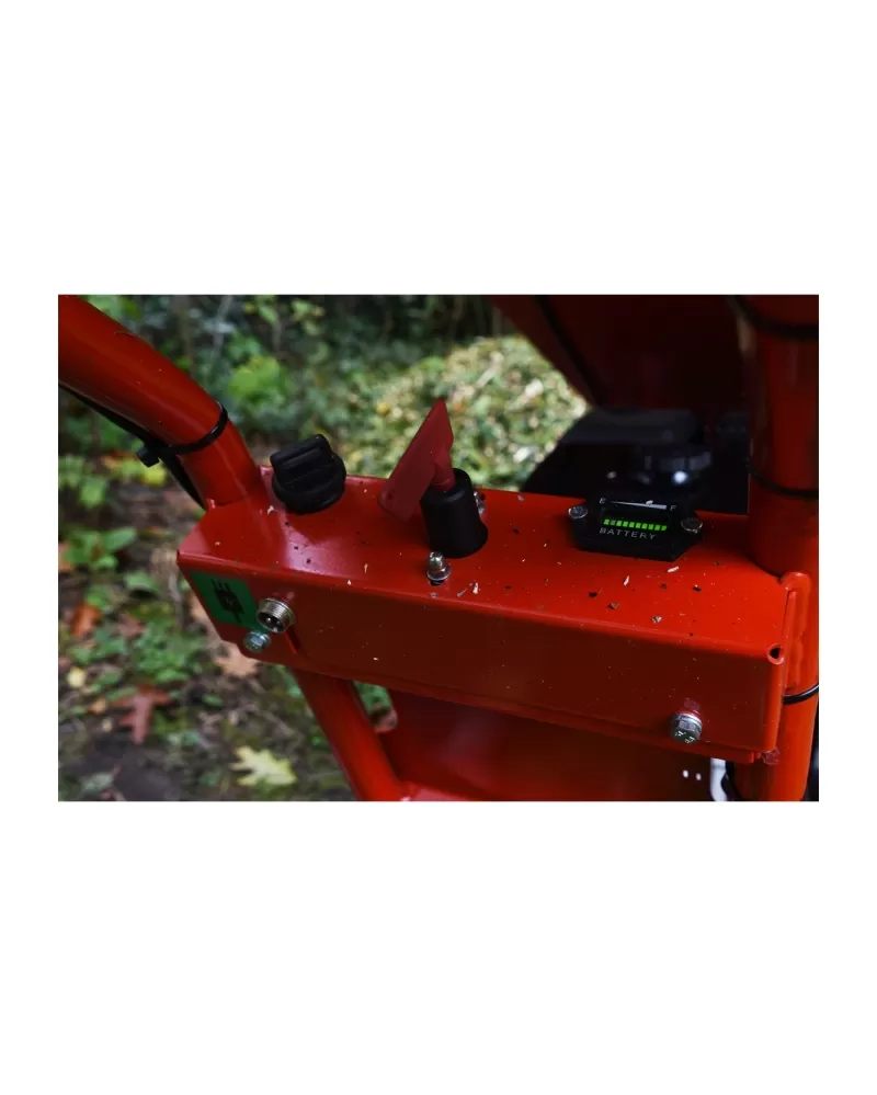 • Pojezd je napájen baterií (2 x 12 V), která umožní stroji ujet na jedno nabití vzdálenost až 6 km na pevném a rovném povrchu nebo 2 km v měkkém či kopcovitém terénu.