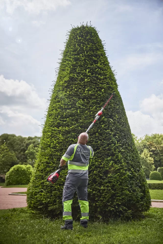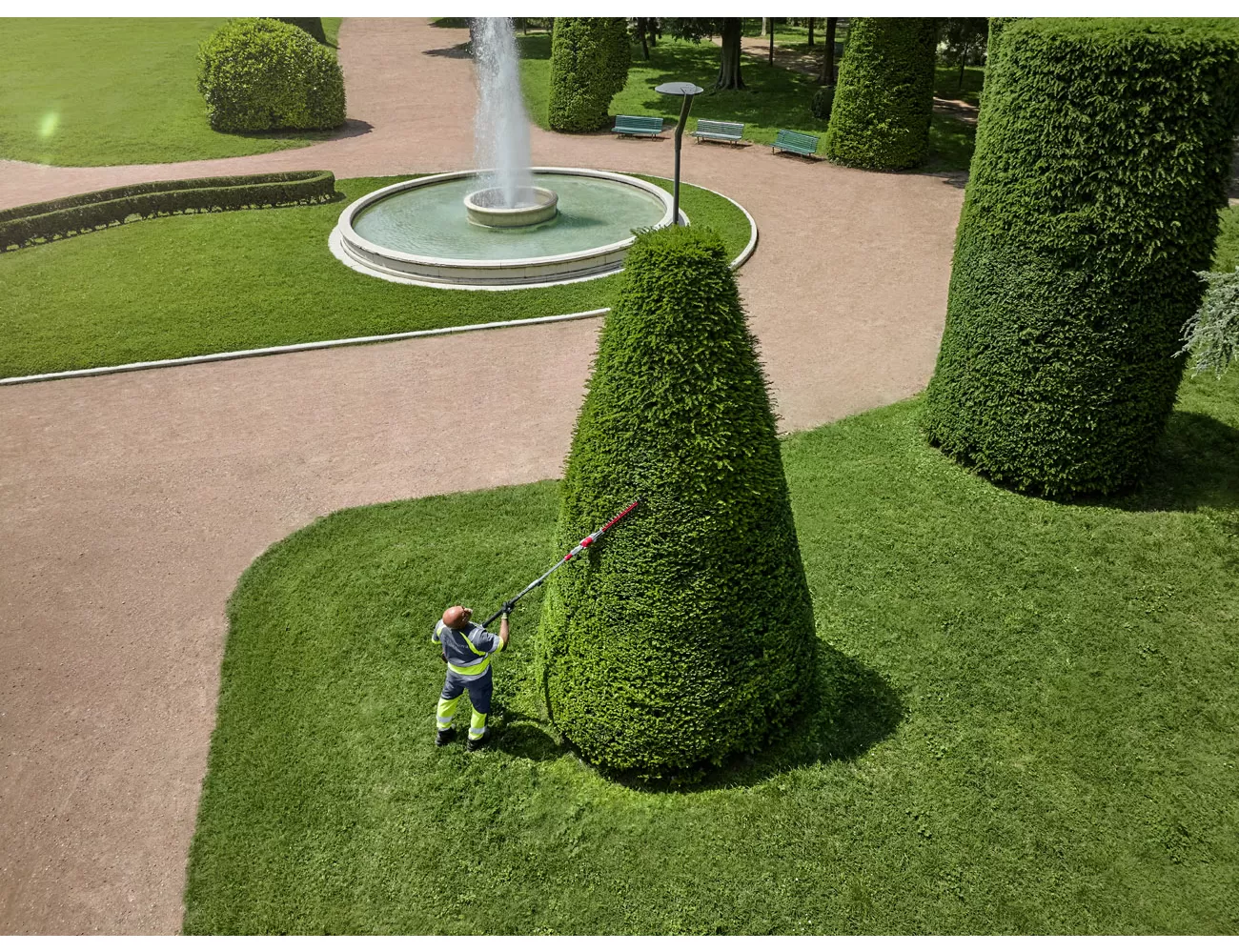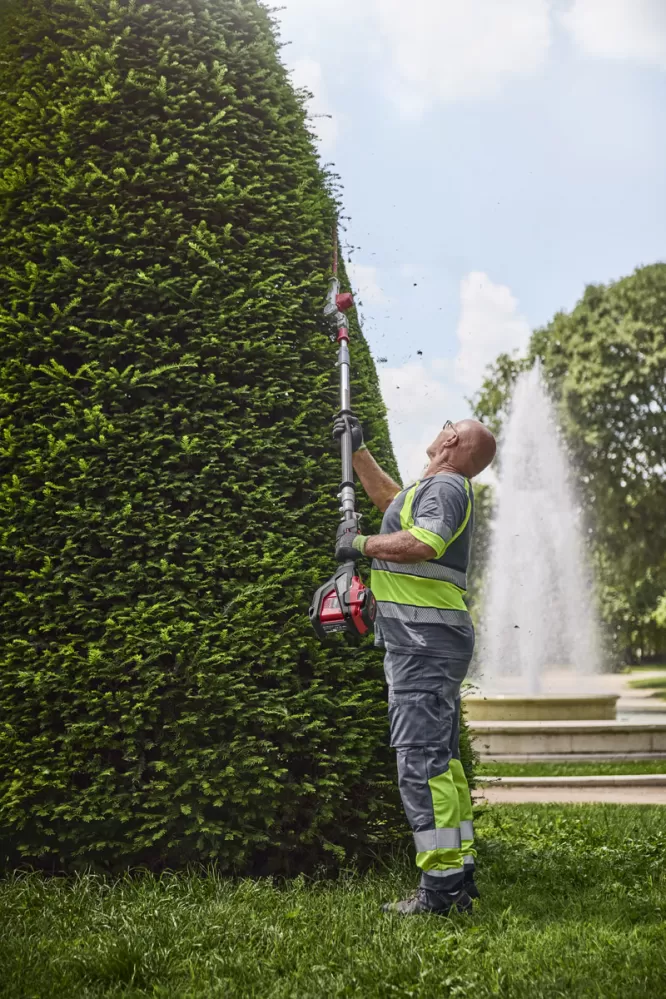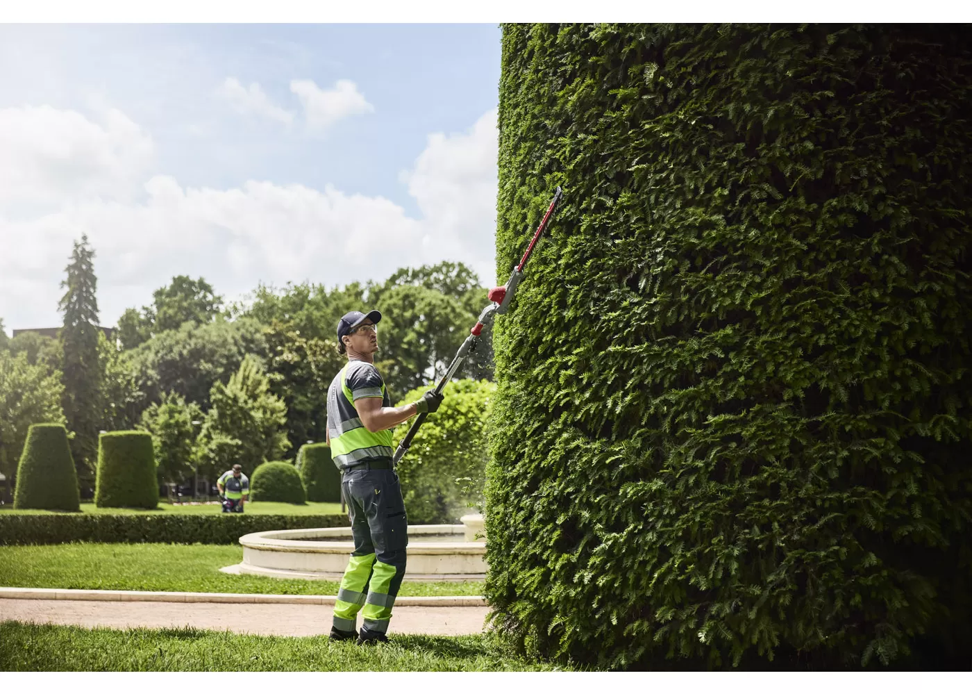 • Pro větší dosah slouží integrovaný zadní nárazník jako přídavná rukojeť při stříhání nejvyšších živých plotů