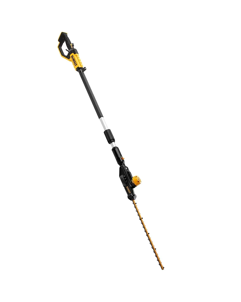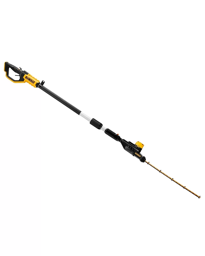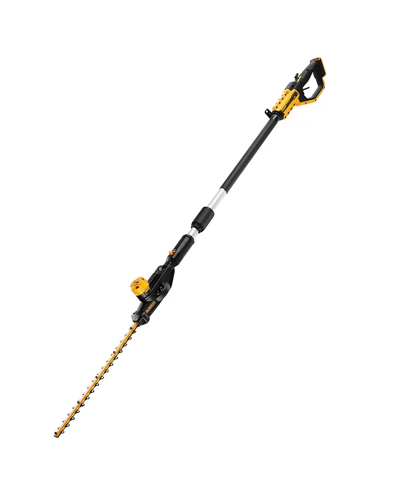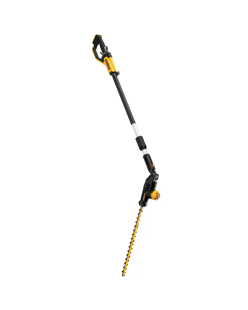 Aku plotostřih s dlouhou rukojetí 18V bez aku DeWALT DCMPH566N vybavený kloubovou hlavou a lištou délky 55 cm.