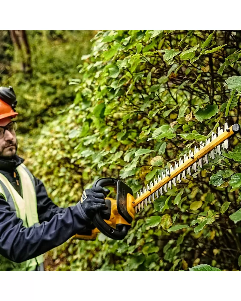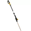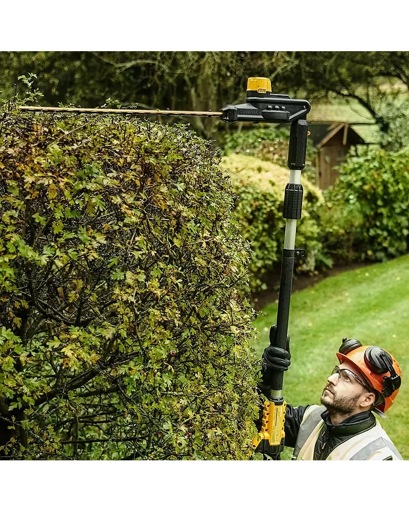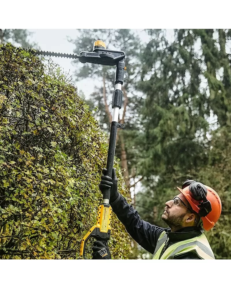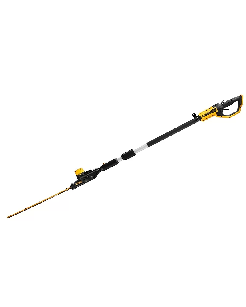 Aku plotostřih s dlouhou rukojetí 18V bez aku DeWALT DCMPH566N vybavený kloubovou hlavou a lištou délky 55 cm.