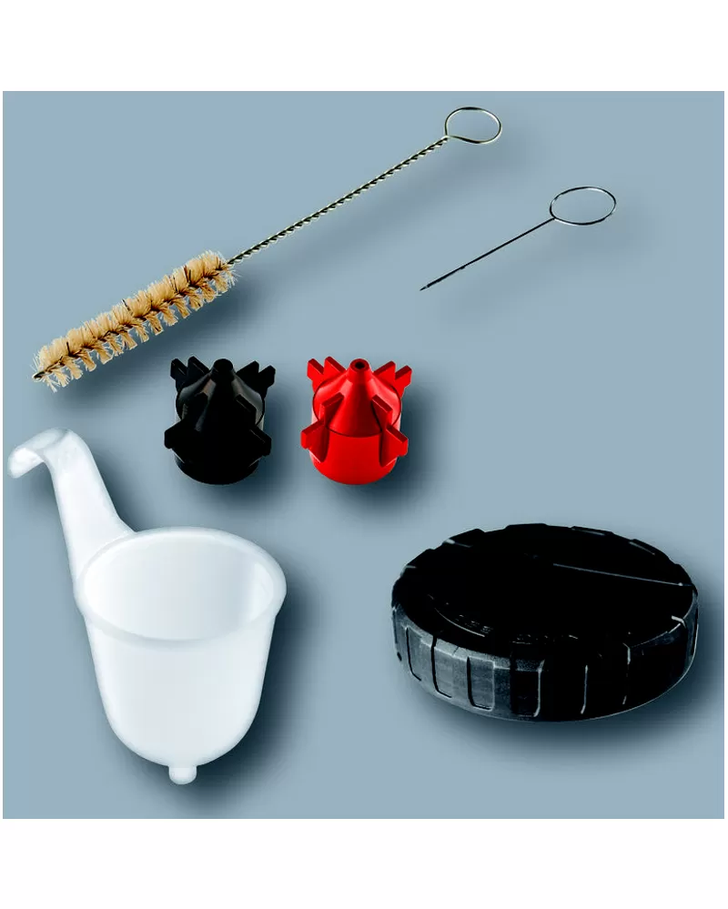 • Součástí dodávky je rovněž čisticí kartáč pro čištění stoupací trubky, čisticí jehla pro čištění rozstřikovací trysky a nádoba na barvu o objemu 800 ml, kterou lze po dokončení práce čistým způsobem uzavřít pomocí přiloženého víka