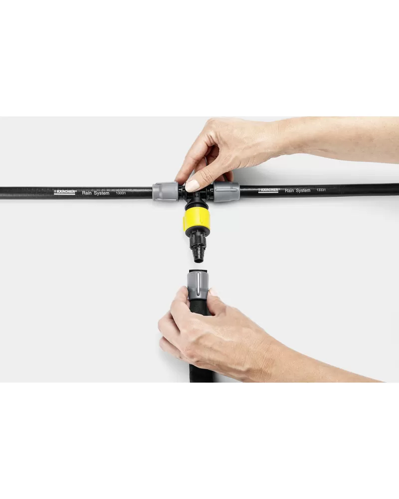 • Spojuje k sobě tři hadice nebo hadice pro kapénkovou závlahu systému Kärcher Rain System® a umožňuje tak pokládání dvou na sobě nezávislých hadicových vedení.