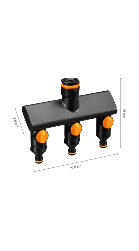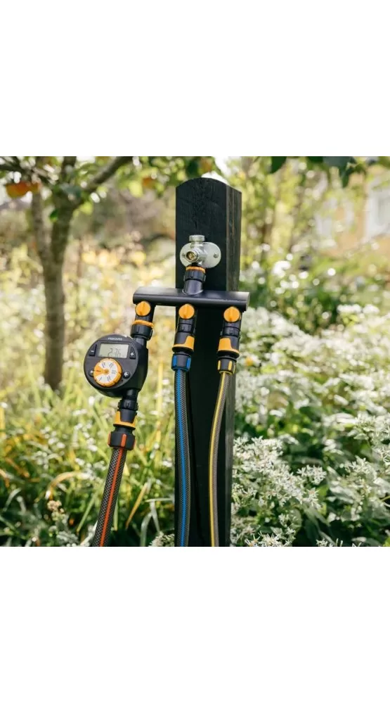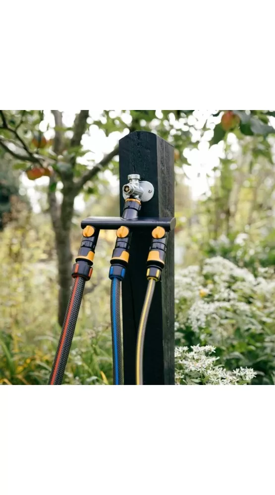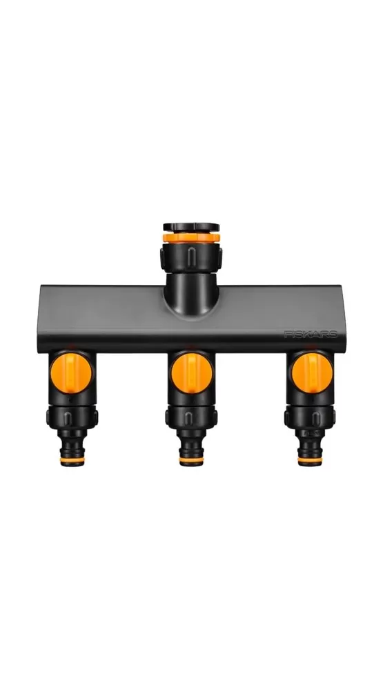 • Trojcestný kohoutkový ventil Fiskars Comfort On/Off rozděluje jeden zdroj vody na tři přípojky s nezávislými ventily pro regulaci průtoku