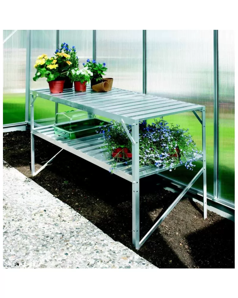 • Hlinikový dvoupolicový regál stojící na zemi.