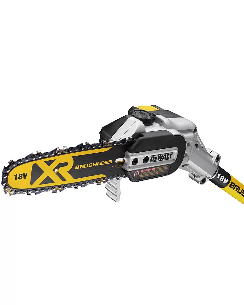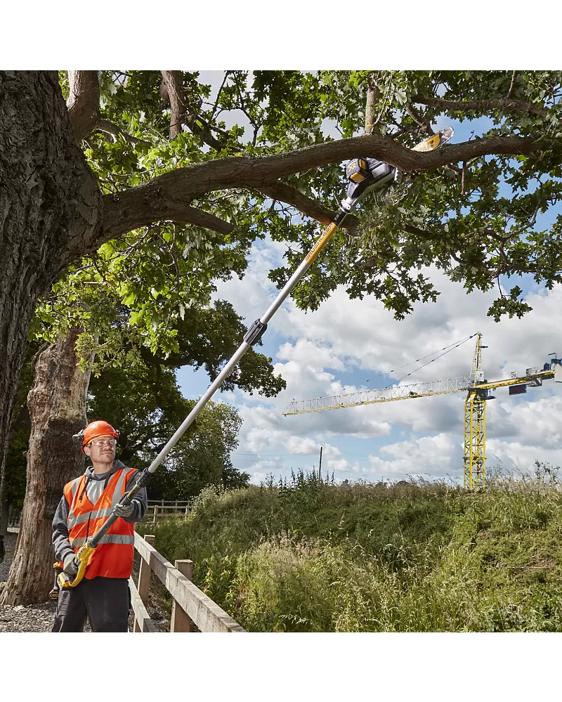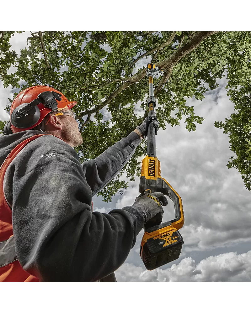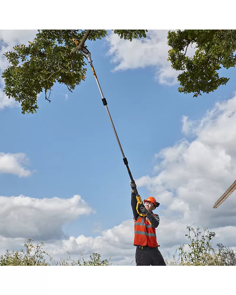Aku prořezávací pila 18V bez aku DeWALT DCMPS567N s lištou délky 20 cm a teleskopickou tyčí s délkou až 3 m.