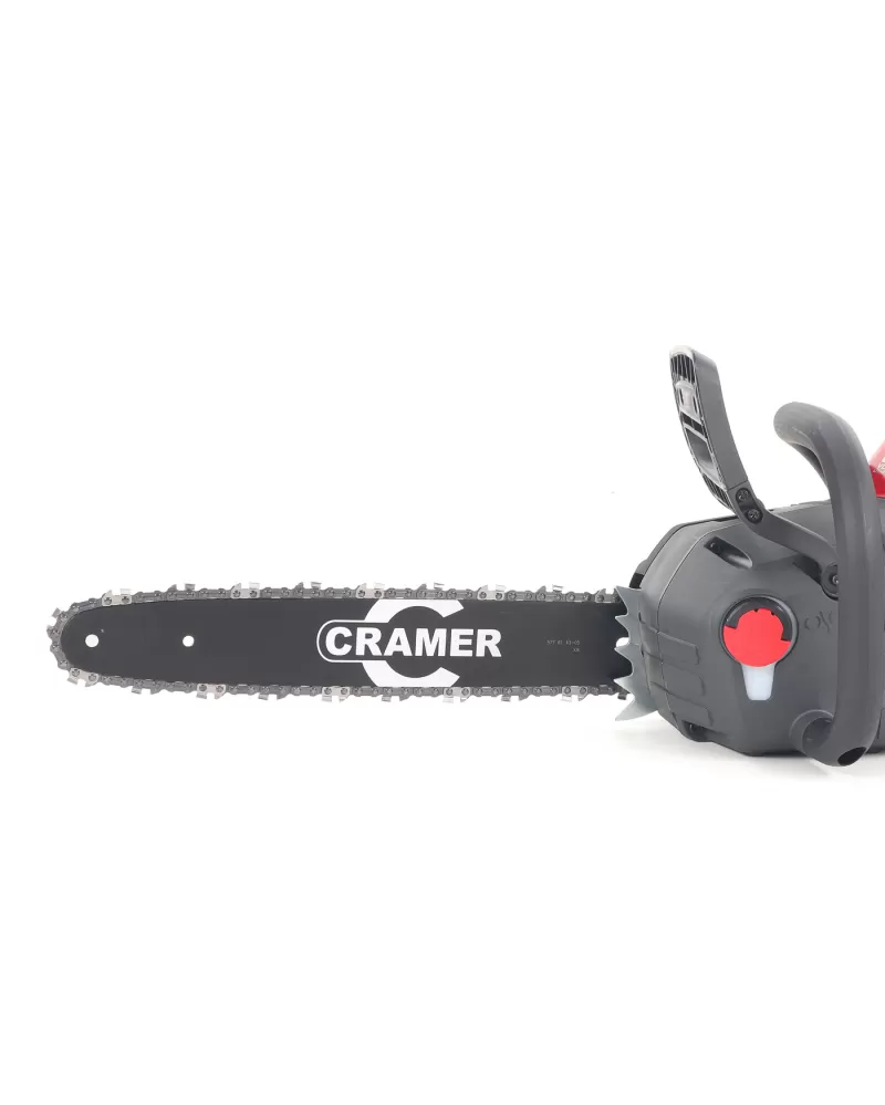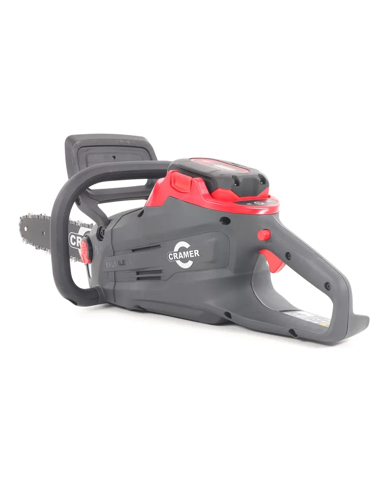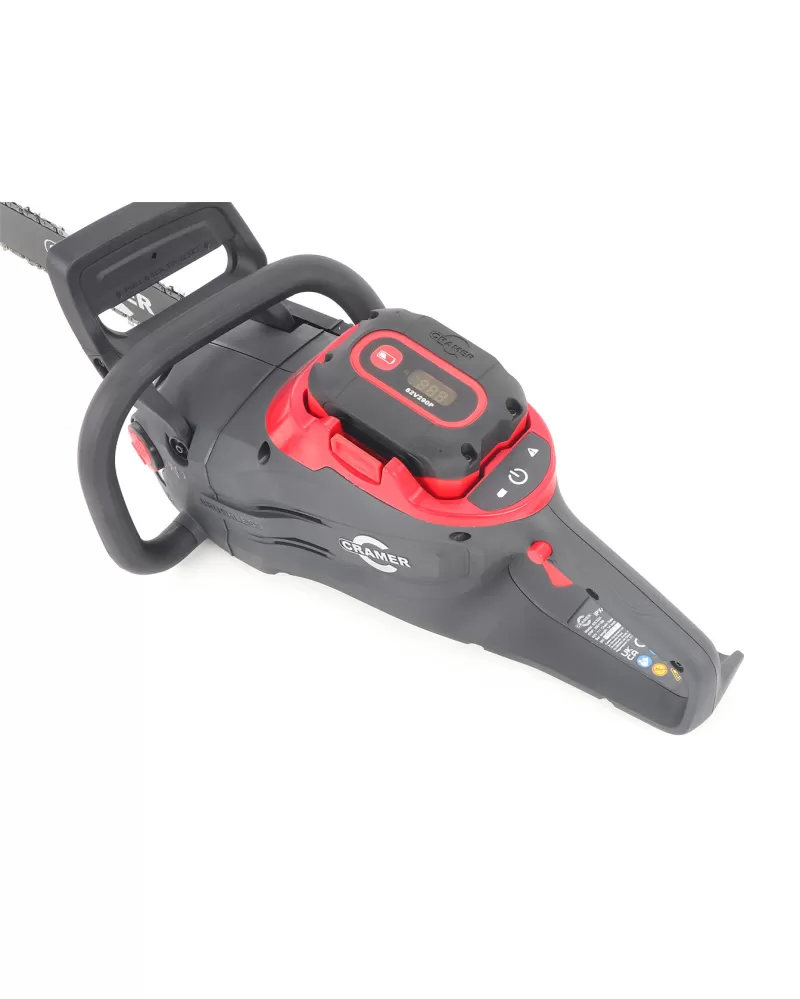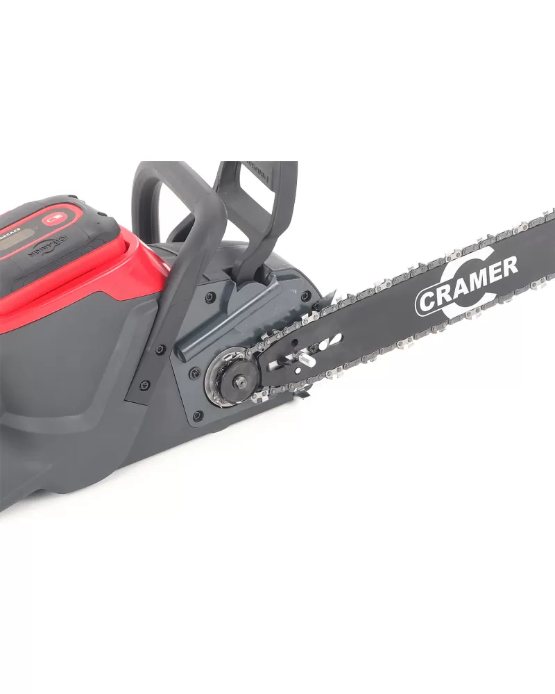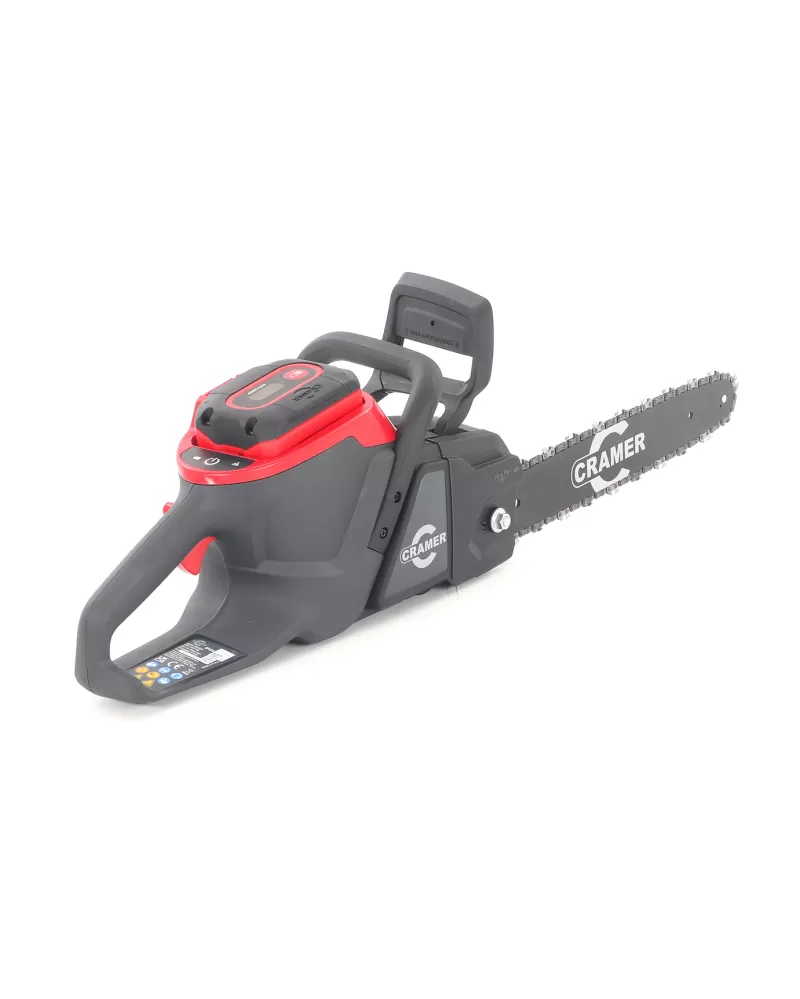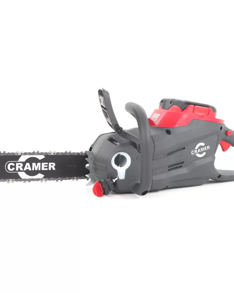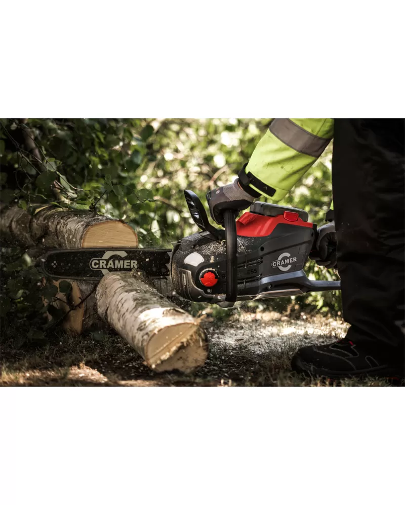 • Bezpečnost je zaručena díky systému startování dvěma tlačítky a brzdě řetězu a lithium-iontová baterie je zaměnitelná se všemi ostatními nástroji Cramer 82V.