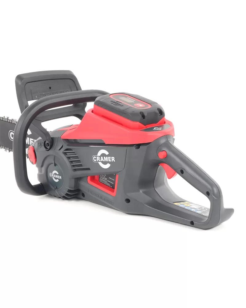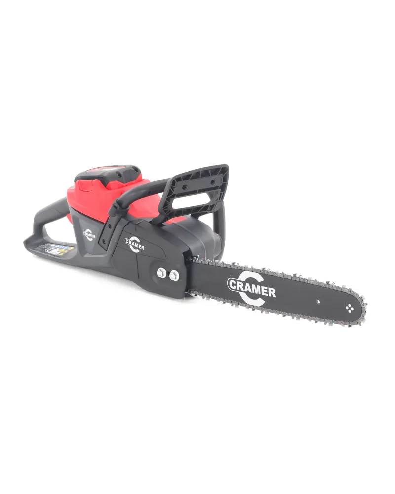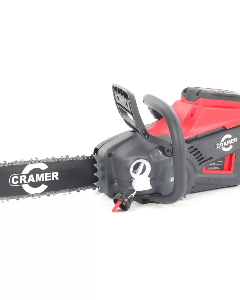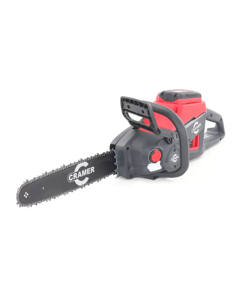• Bezpečnost je zaručena díky systému startování dvěma tlačítky a brzdě řetězu a lithium-iontová baterie je zaměnitelná se všemi ostatními nástroji Cramer 82V.