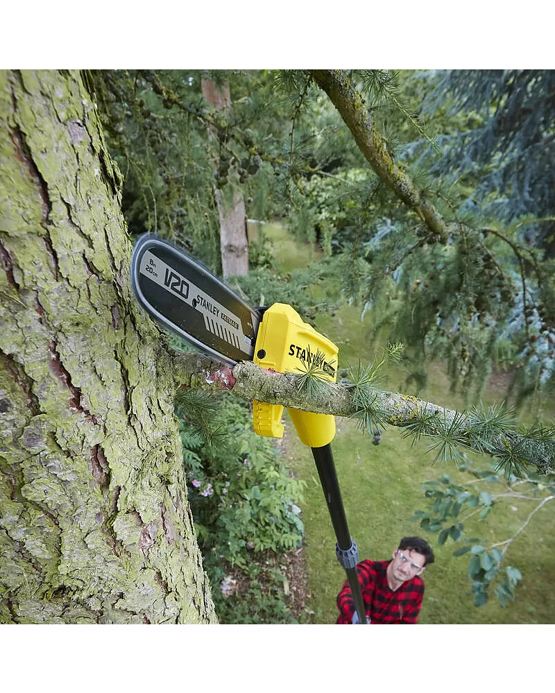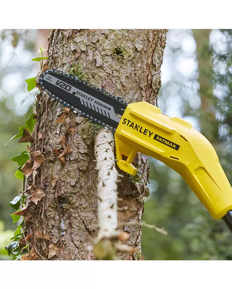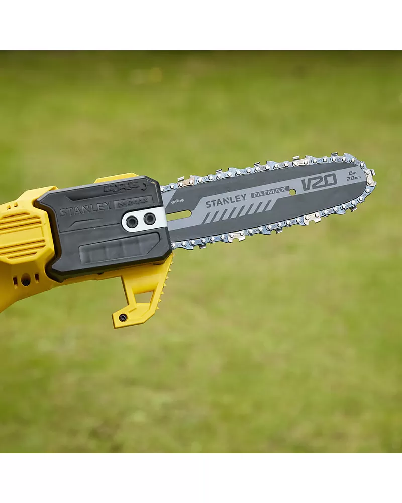 Aku řetězová pilka na větve V20 bez aku Stanley FatMax SFMCPS620B s lištou 20 cm pro prořezávání větví do průměru 15 cm.