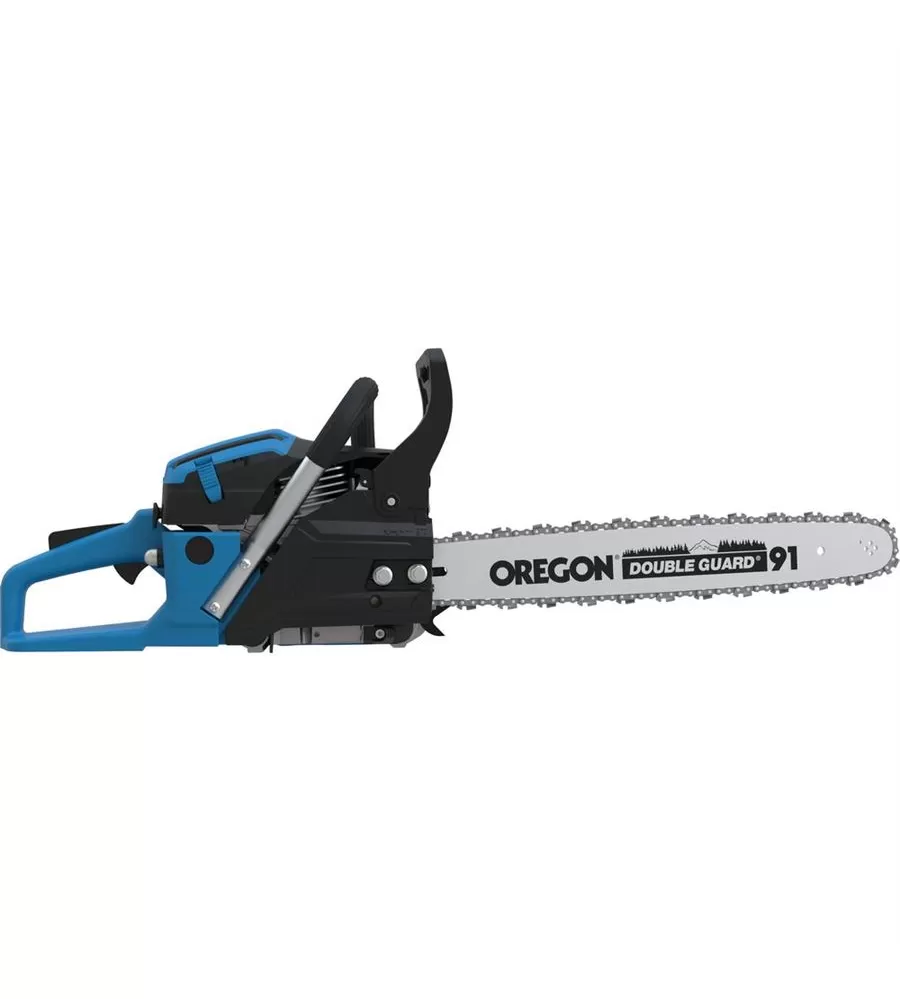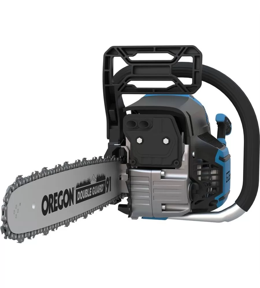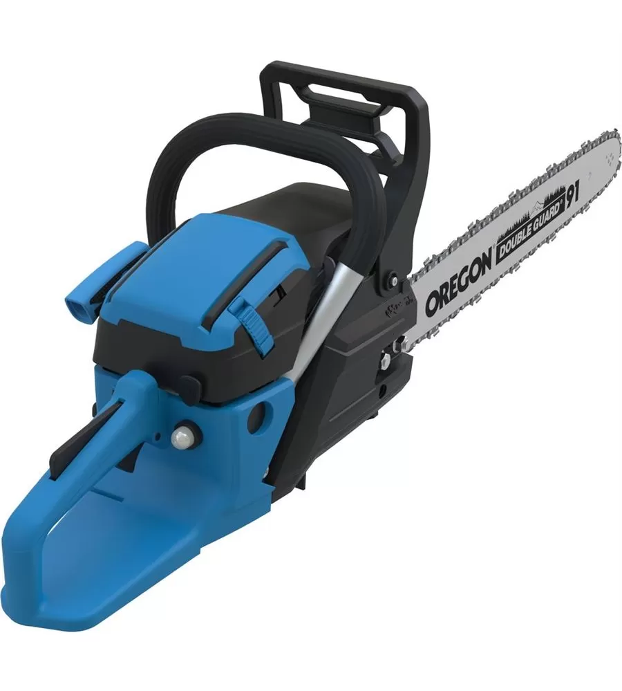 Výkonná benzinová pila, určená k řezání dřeva v zahradě a okolo domu.