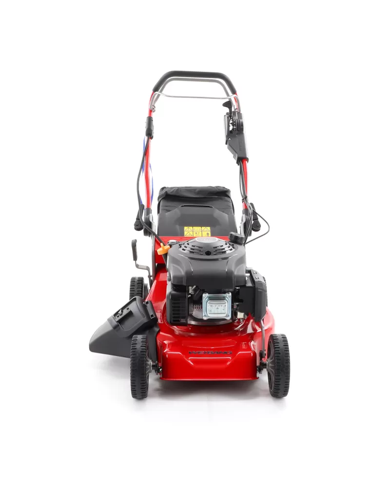 Benzínová sekačka s pojezdem Weibang WB 456 SCVE 6v1 což znamená, že sekačka umí sbírat posečenou trávu do koše, mulčuje, vyhazuje trávu bokem, zadním deflektorem a má variabilní pojezd daný 7 rychlostním variátorem.