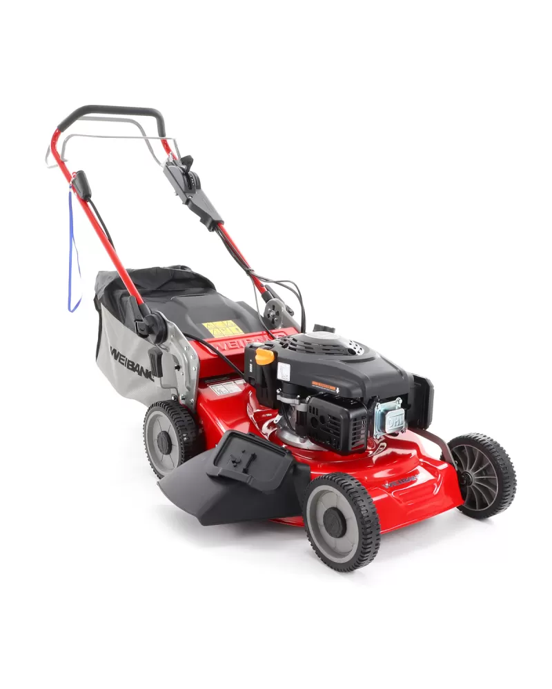 Benzínová sekačka s pojezdem Weibang WB 506 SCVE 6v1 což znamená, že sekačka umí sbírat posečenou trávu do koše, mulčuje, vyhazuje trávu bokem, zadním deflektorem a má variabilní pojezd daný 7 rychlostním variátorem.