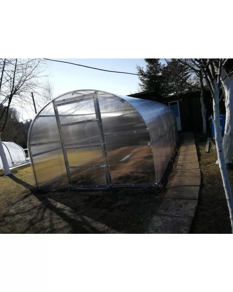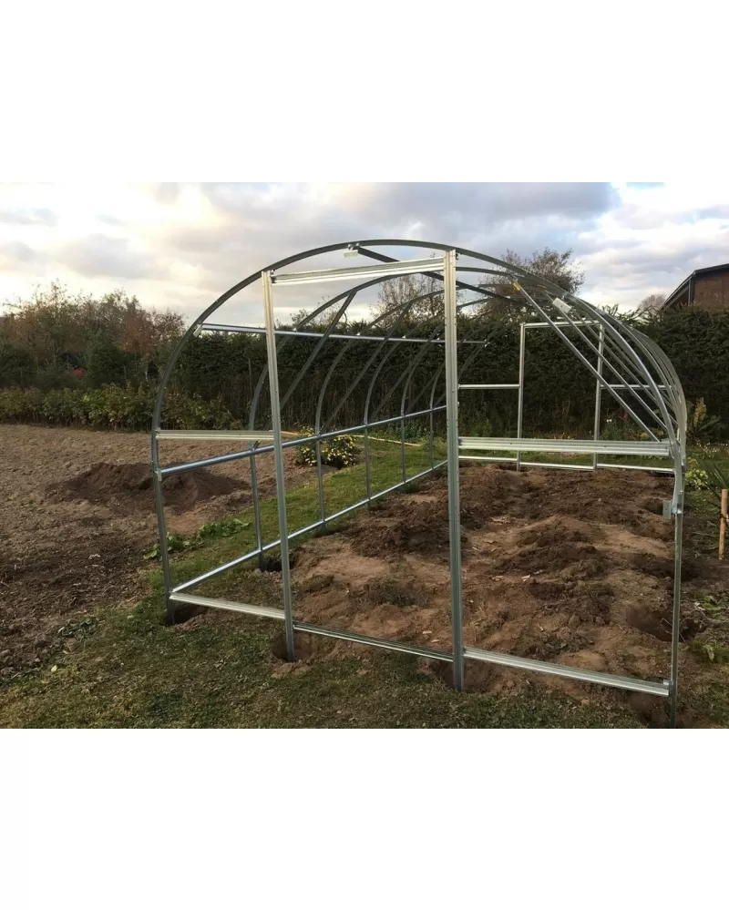 • Konstrukce skleníku je sešroubovaná z žárově pozinkovaných ocelových profilů síly 1 mm a šířky 56 mm (výrobce oceli - společnost United States Steel). Profily jsou žárově pozinkované = ocel se po příslušné předběžné úpravě ponoří do zinkové lázně o teplotě cca 450°C, zinek a ocel přitom spolu reagují a na povrchu oceli se vytvoří slitina železa a zinku. Toto nezničitelné spojení zinku a oceli vytvoří extrémně silnou odolnost vůči korozi. Jednotlivá žebra nosných oblouků jsou od sebe vzdálena osově 100 cm. Přední čelo má dvoudílné dveře na pantech, zadní čelo obsahuje větrací okénko. Skleník není průchozí. Jako příplatkové příslušenství lze dokoupit střešní ventilační okno, automatický otvírač okna, různé druhy regálů, teploměry, vlhkoměry apod.