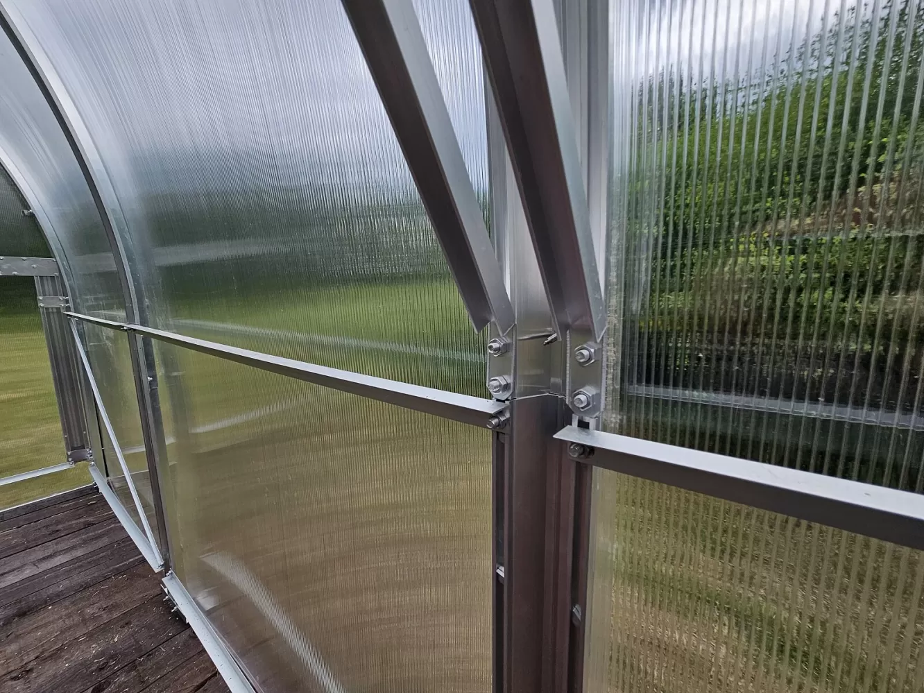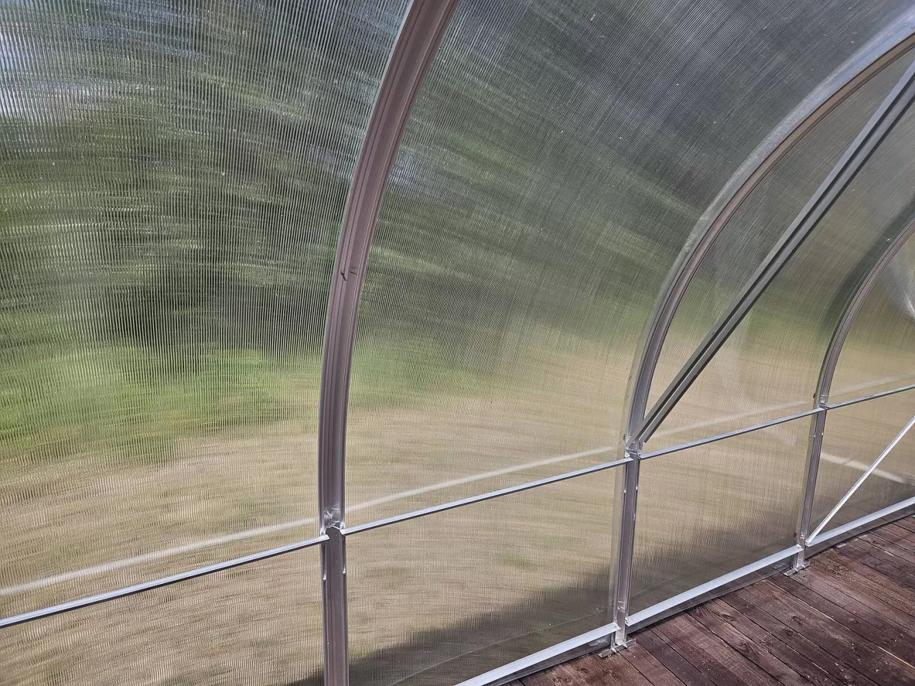• šířka 2,9 m, cca délky 4 / 6 / 8 m, masivní 1 mm silný a 65 mm široký eloxovaný hliníkový profil, rozteč oblouků 100 cm, vnitřní podpěry obloukové konstrukce, dvojité dveře vpředu, ventilační okno vzadu, prosklení nutno vyřezat z dodaných polykarbonátových desek