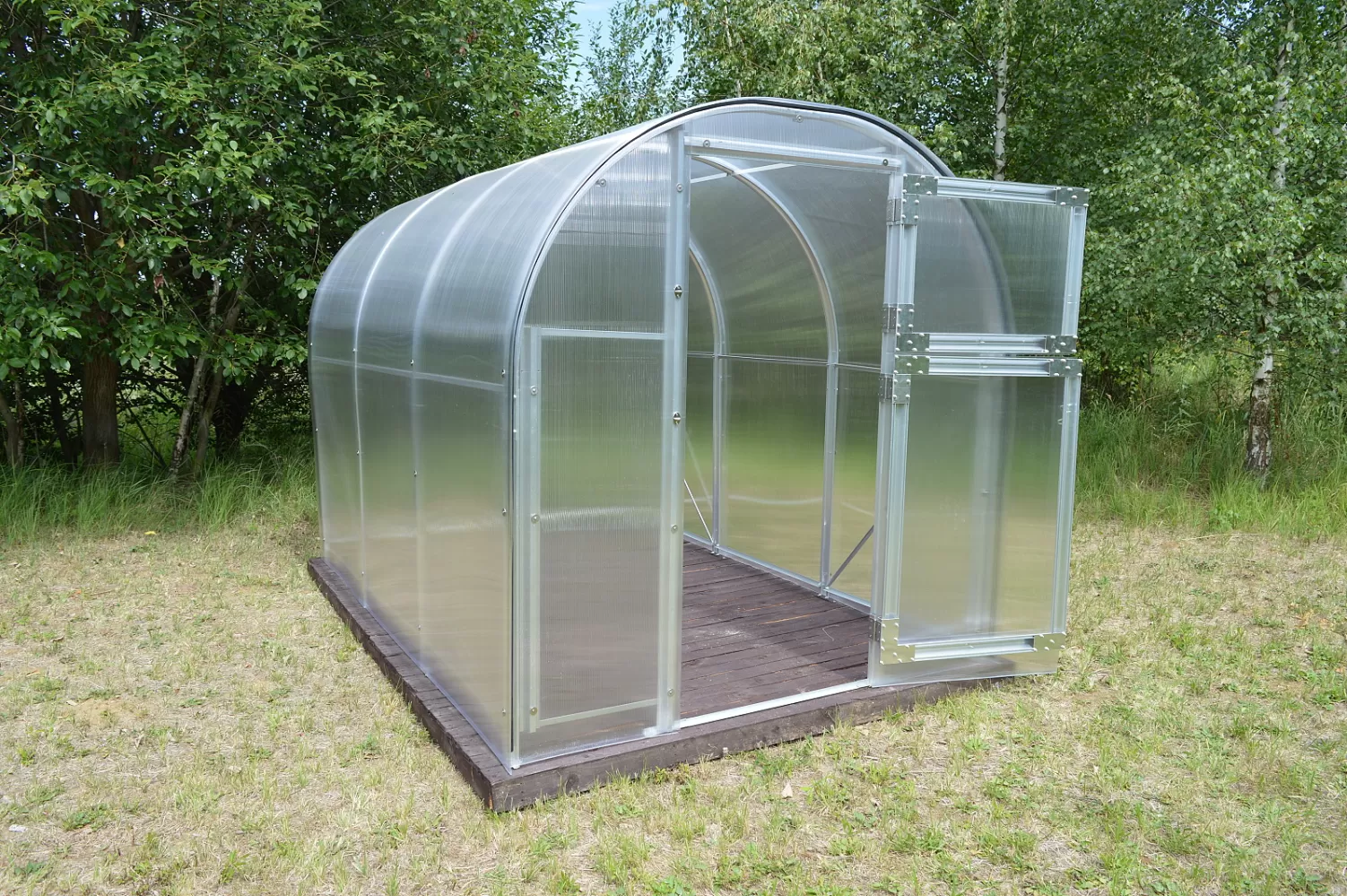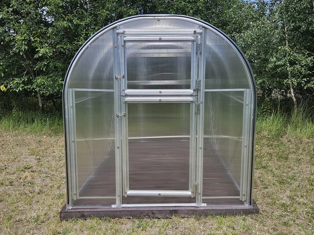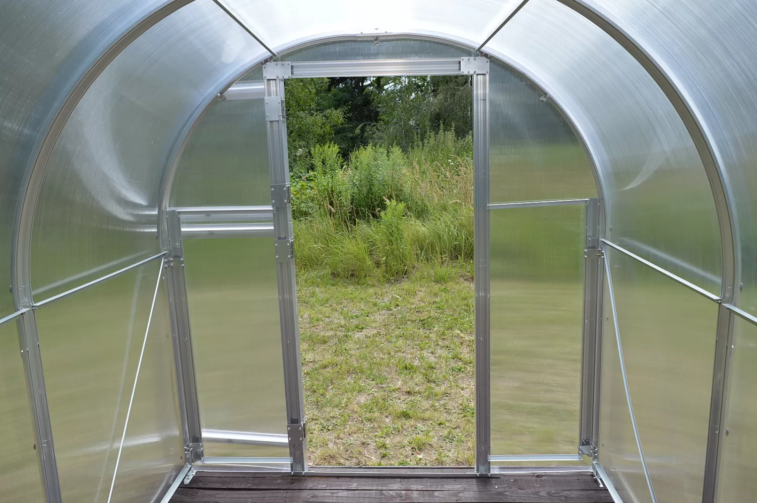 • šířka 2,9 m, cca délky 4 / 6 / 8 m, masivní 1 mm silný a 65 mm široký eloxovaný hliníkový profil, rozteč oblouků 100 cm, vnitřní podpěry obloukové konstrukce, dvojité dveře vpředu, ventilační okno vzadu, prosklení nutno vyřezat z dodaných polykarbonátových desek