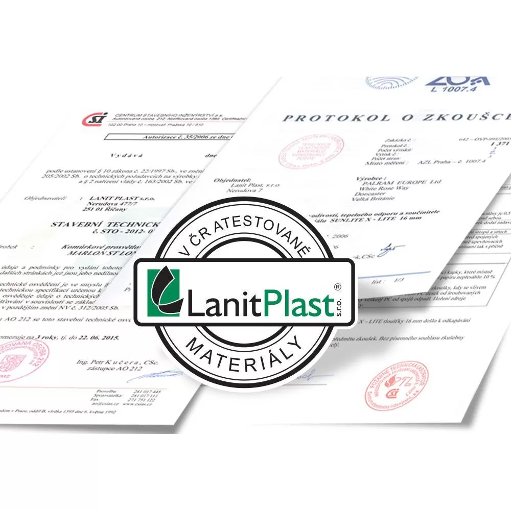• Polykarbonát - velmi kvalitní dvoustěnný polykarbonát se silným UV filtrem (na slunci a mrazu nekřehne, ani nežloutne). Z důvodu zajištění maximální kvality si prosklení sami vyrábíme z kvalitního polykarbonátu MARLON (výrobce Brett Martin Velká Británie). Polykarbonát je v ČR otestován státem akreditovanými zkušebnami jako stavební materiál. Na polykarbonát je poskytována smluvní záruka 10 let na nerozbitnost krupobitím (přesná specifikace záruky je obsažena v záručním listě).