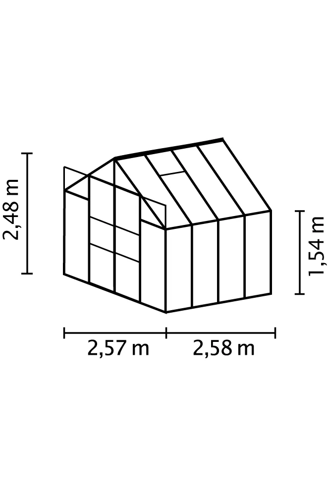 Hliníkový skleník, š 2,57 x d 2,58 m, černá barva, 2x stř. okno, polykarbonát 6 mm, plocha 6,63 m2.