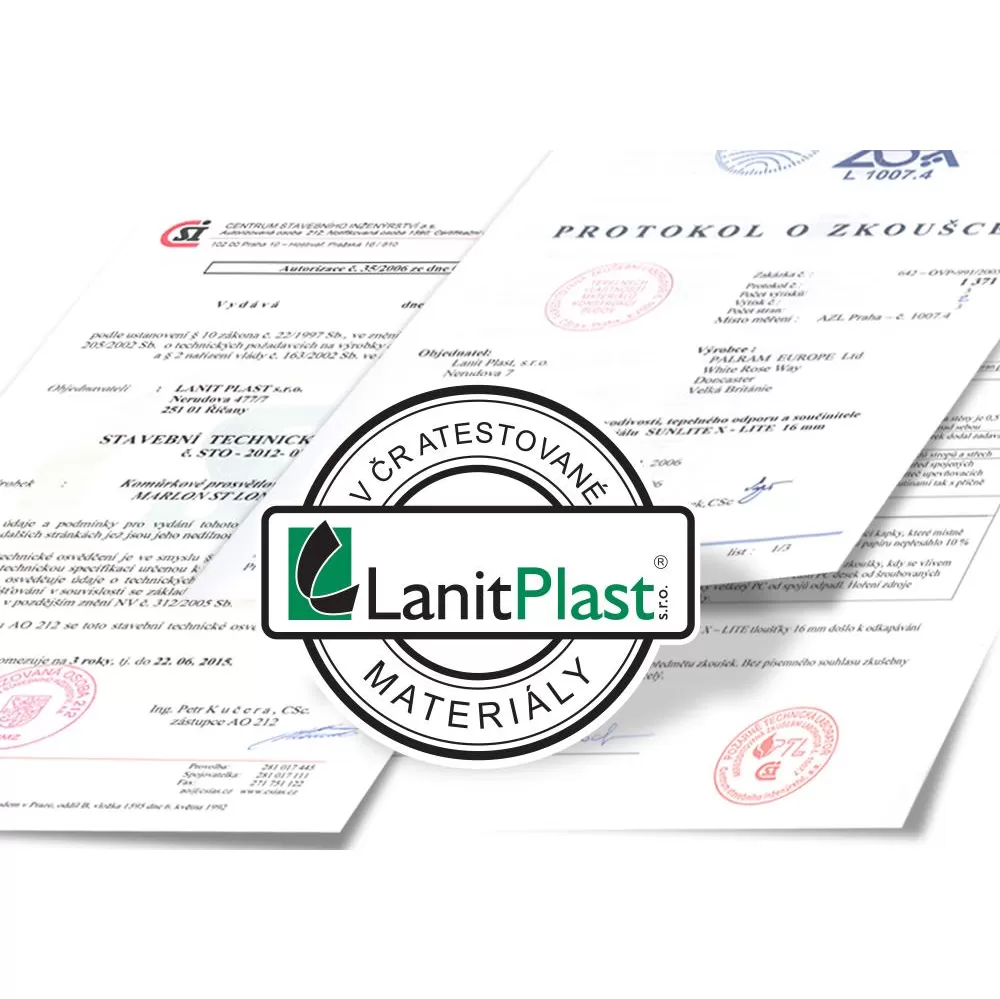 Polykarbonát - prémiový britský dvoustěnný polykarbonát 6 mm se silným UV filtrem (proto na slunci nežloutne a nekřehne). Z důvodu zajištění maximální kvality skleníku dodáváme ke konstrukci prosklení z kvalitního polykarbonátu MARLON (výrobce Brett Martin Velká Británie), který v ČR prošel náročnými testy ve státem akreditovaných zkušebnách jako stavební materiál. Navíc disponuje zkušebním protokolem ze Státního zdravotního ústavu Praha, který potvrzuje, že se z polykarbonátu neuvolňují žádné škodlivé látky. Můžete tak nerušeně pěstovat zeleninu bez obav o své zdraví. Smluvní prodloužená záruka 10 let na nerozbitnost polykarbonátu krupobitím je u skleníků od LANIT PLASTU samozřejmostí.