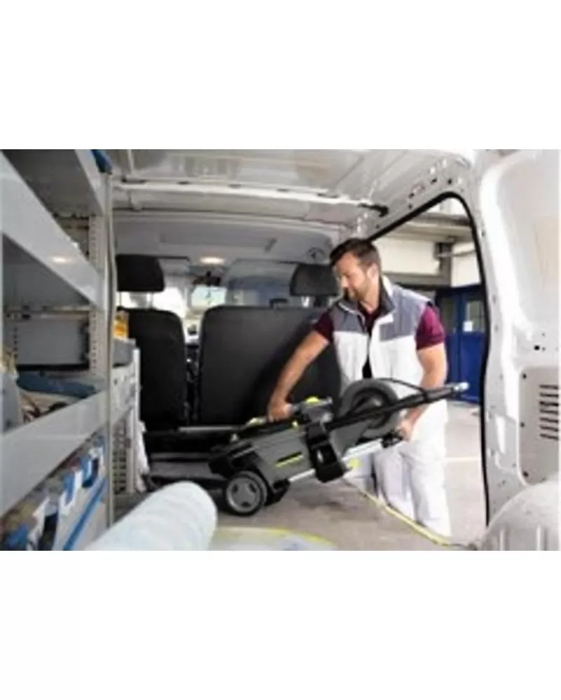 Integrované držadlo na přední straně stroje umožňuje lehkou nakládku a pohodlnou dopravu. Držadlo se zasune stisknutím tlačítka. Kompaktní konstrukce.