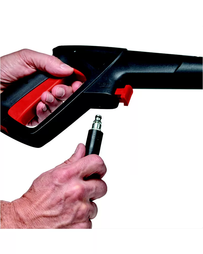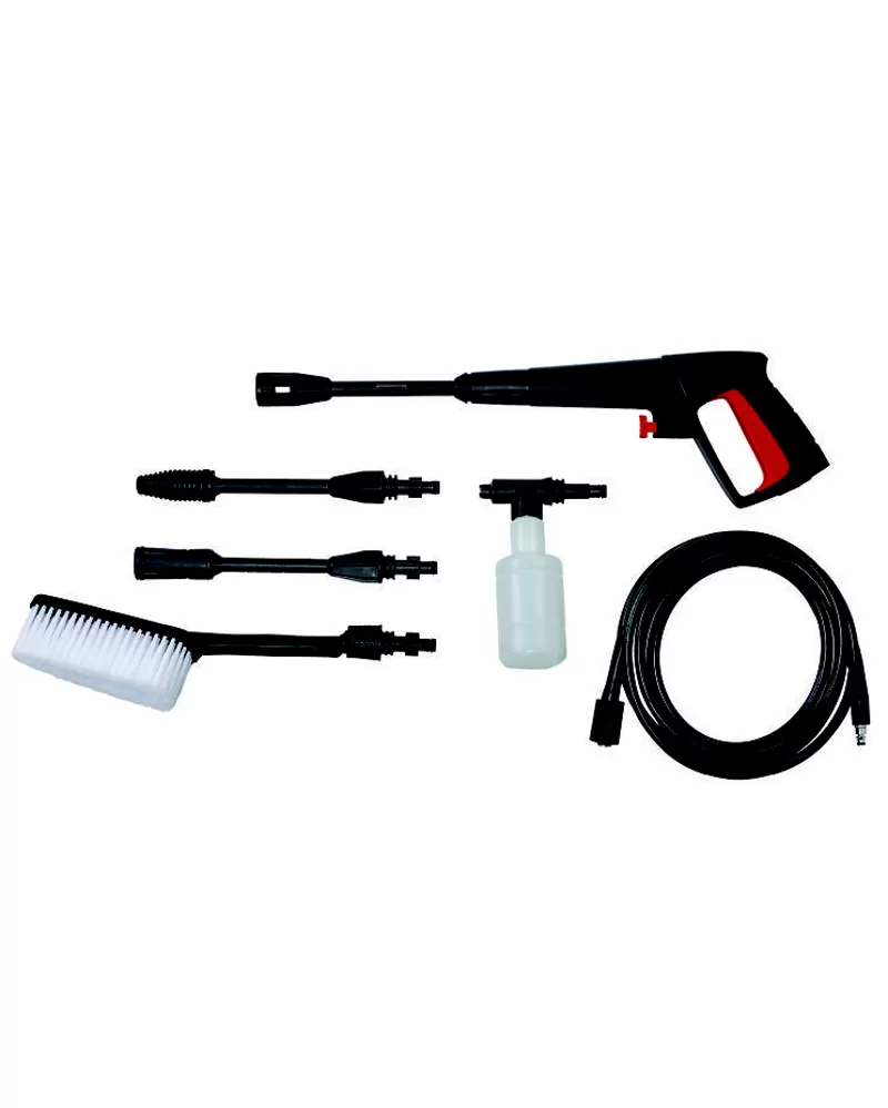 • Součástí dodávky je pistole, tlaková hadice, přívodní trubka, bodová a široká tryska, rotační tryska, kartáč a nádoba na pěnu