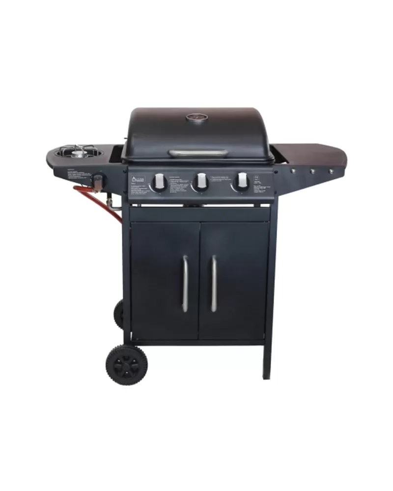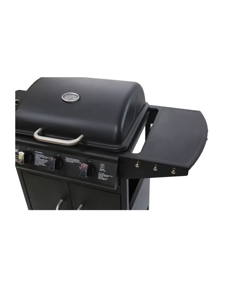 • Gril má kvalitně lakované víko s hliníkovým madlem a zabudovaným teploměrem, odkládací poličku na pravé straně a praktický odkládací prostor pod grilem, který je přístupný dvířky zepředu