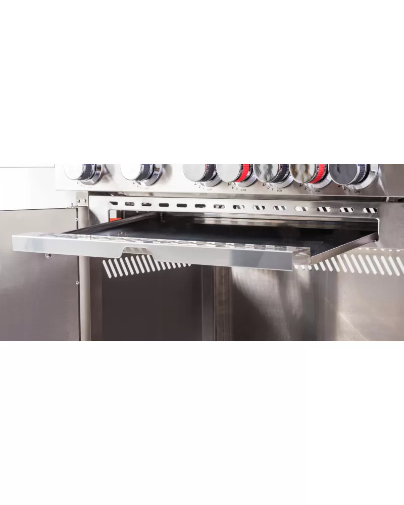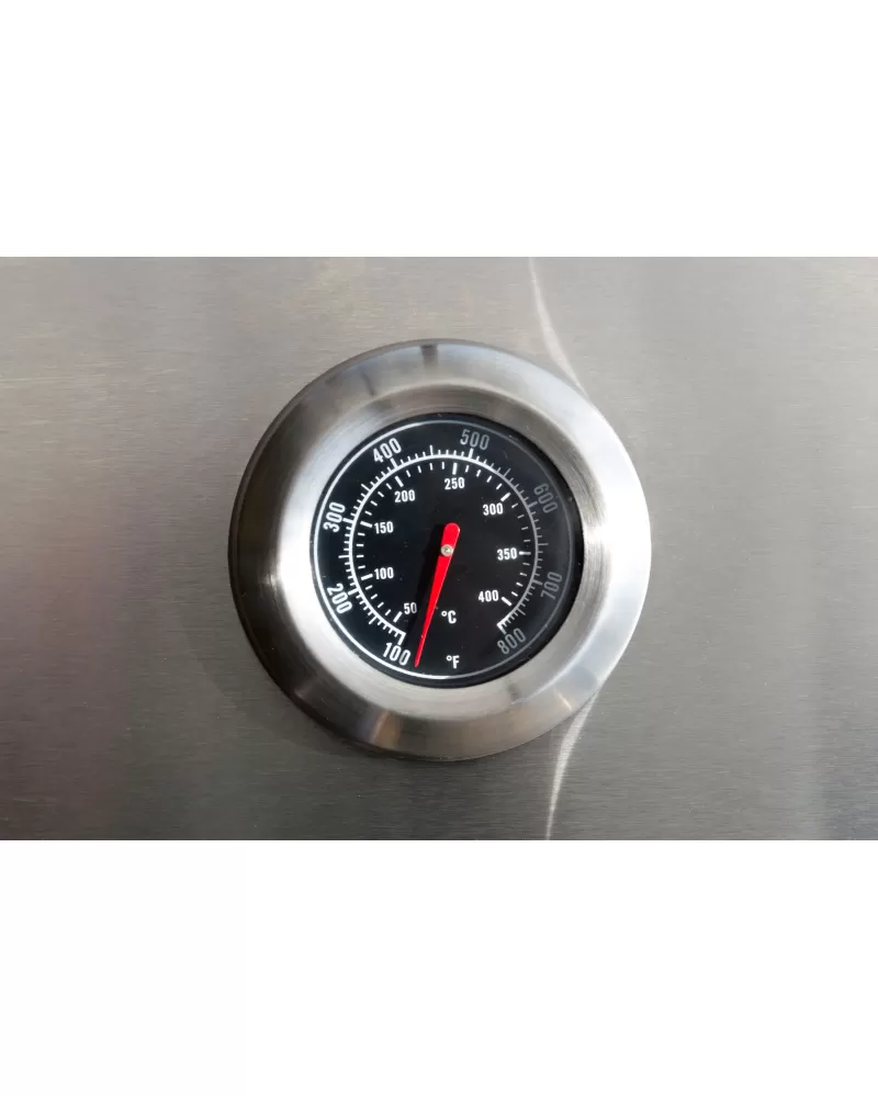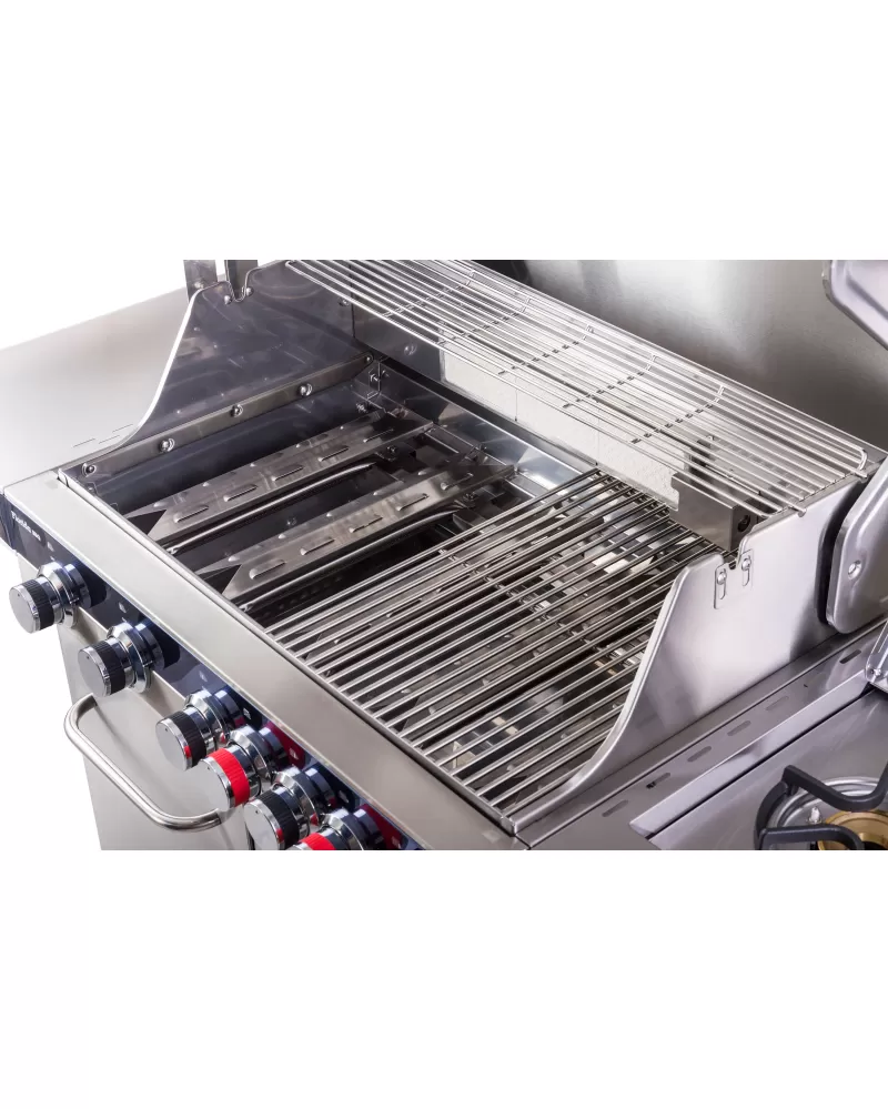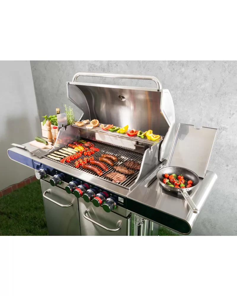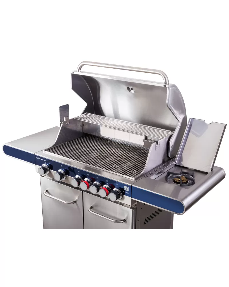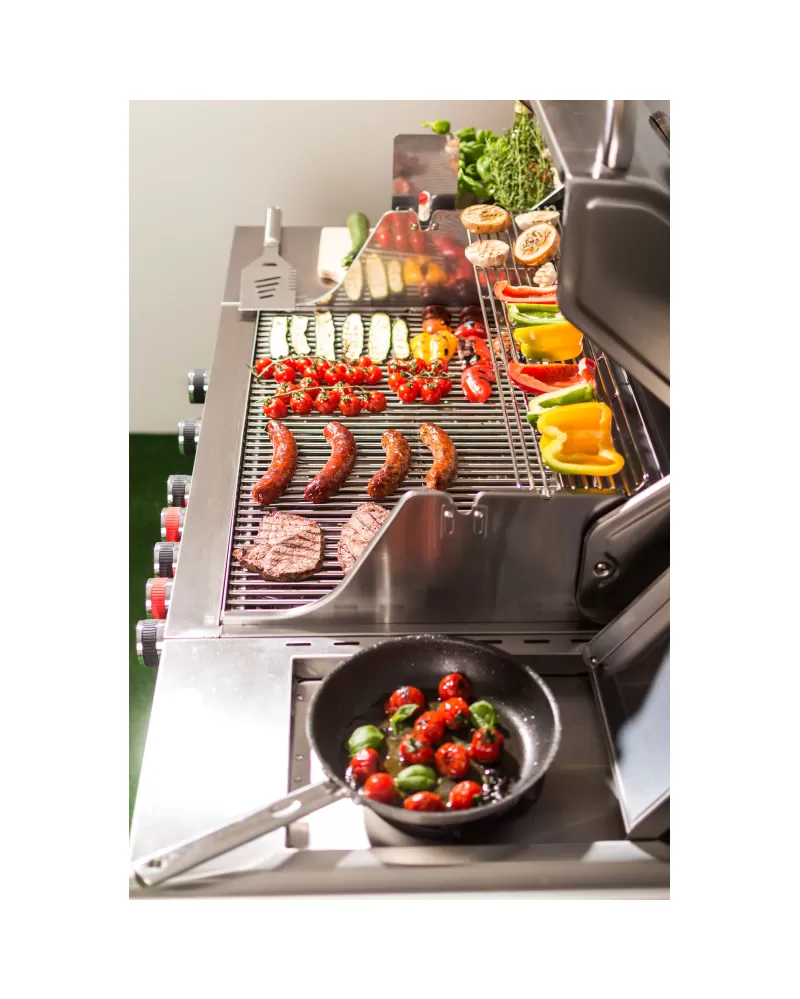 • Nerezový gril se 7 hořáky (7 x 4 kW), prakticky řešenými odkládacími plochami i teploměrem ve víku stojí za pozornost.