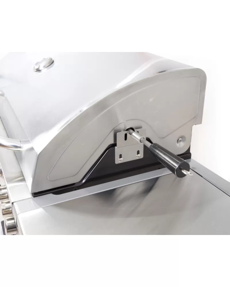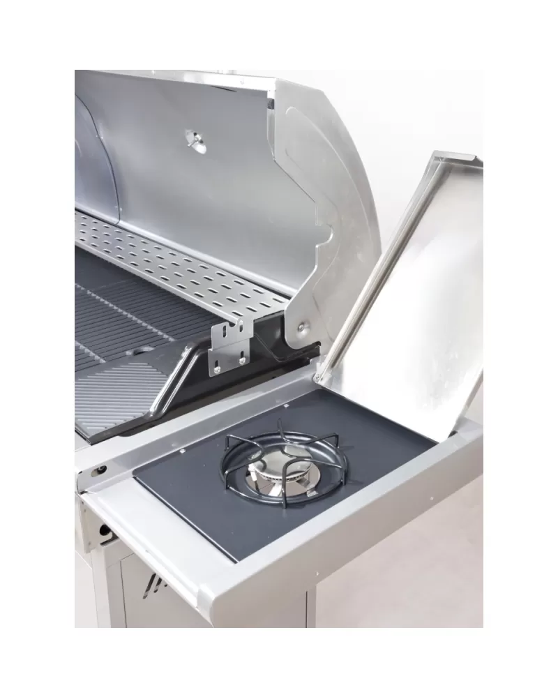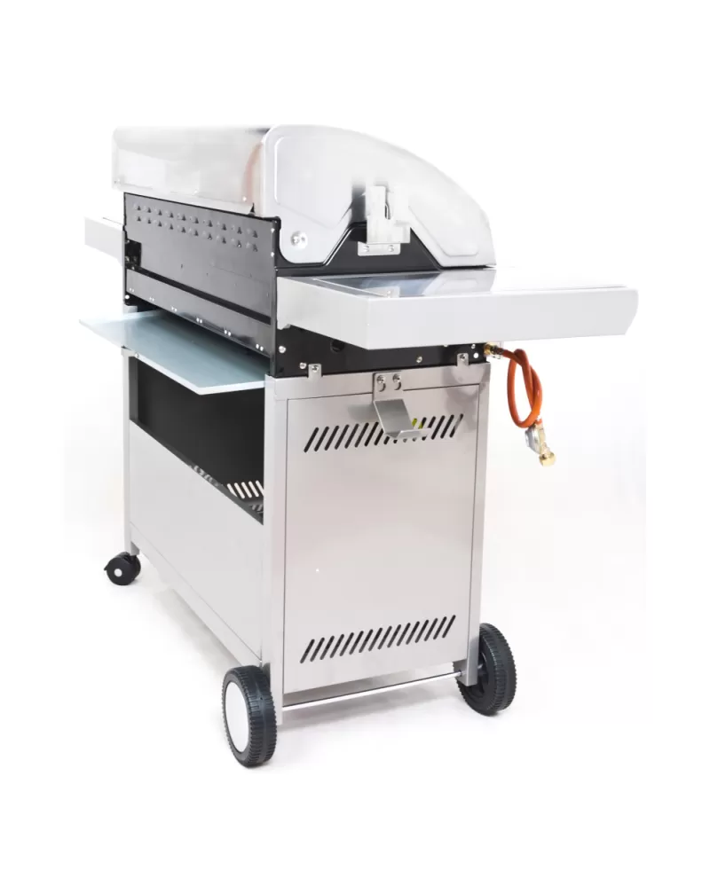 • Zahradní nerezový plynový gril je opatřen odklápěcím krytem grilovací plochy a odkládacími poličkami na obou stranách.