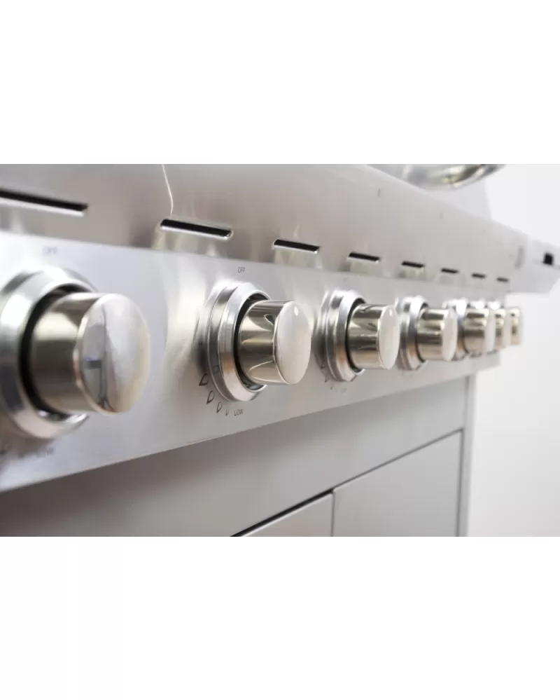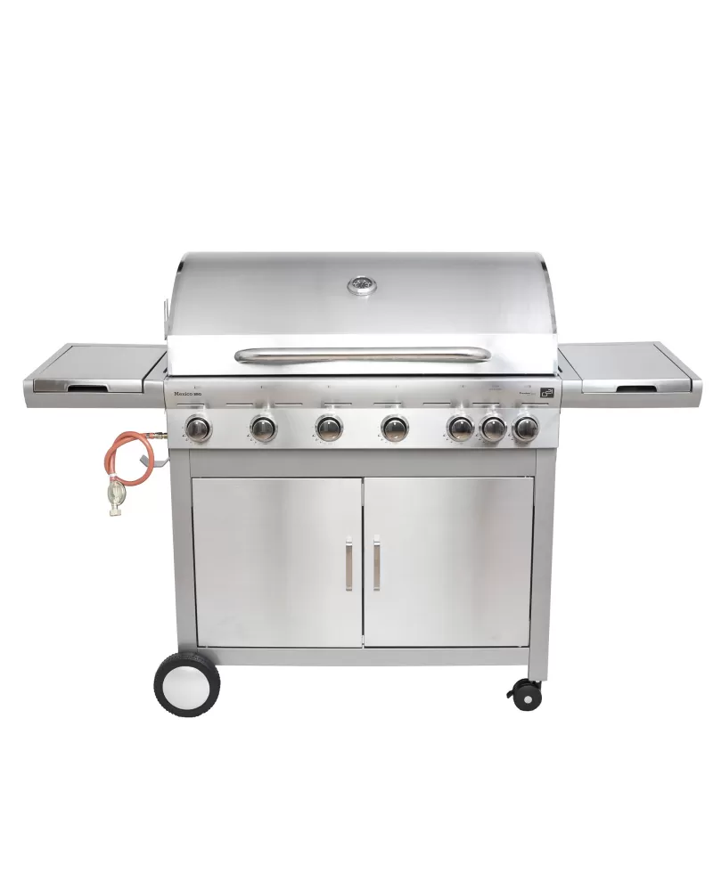 • Plynový gril G21 Mexico BBQ Premium Line je vybaven systémem Flame Tamer, 6 hlavními nerezovými hořáky a jedním bočním hořákem s elektrickým zapalováním a plynovou regulací.
