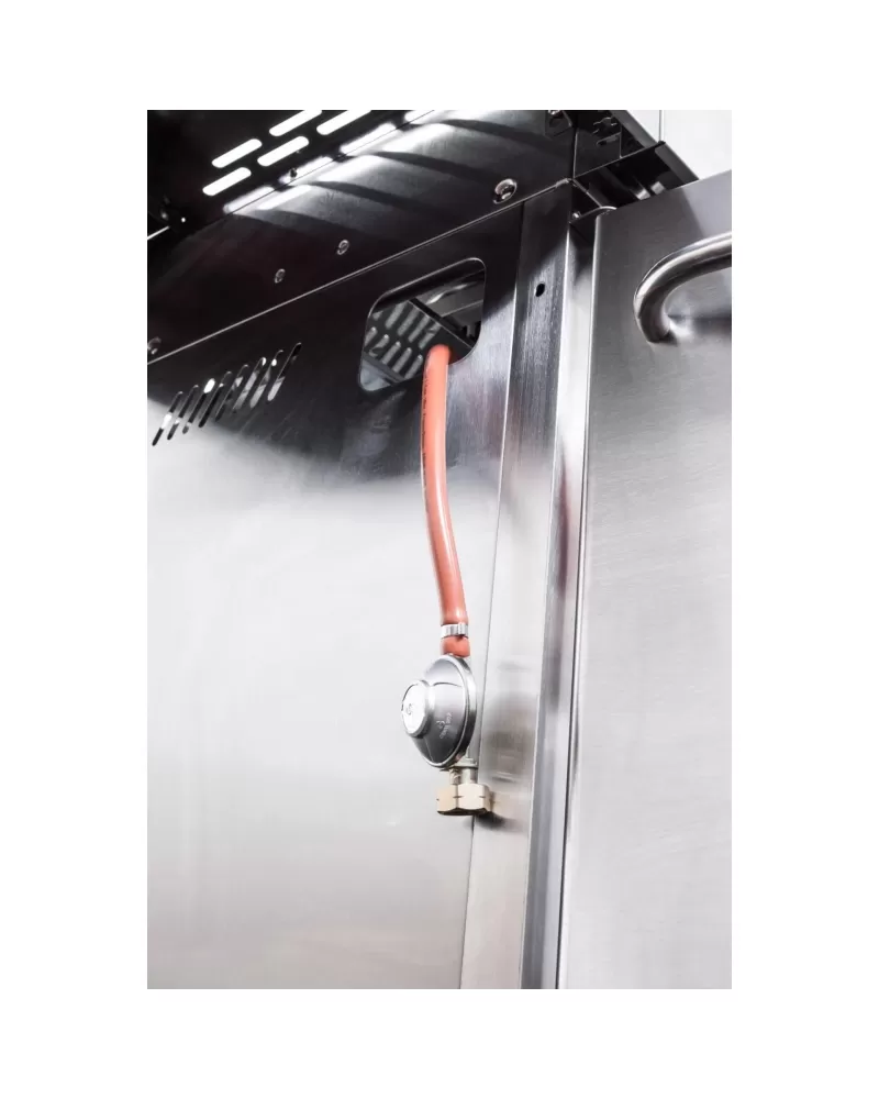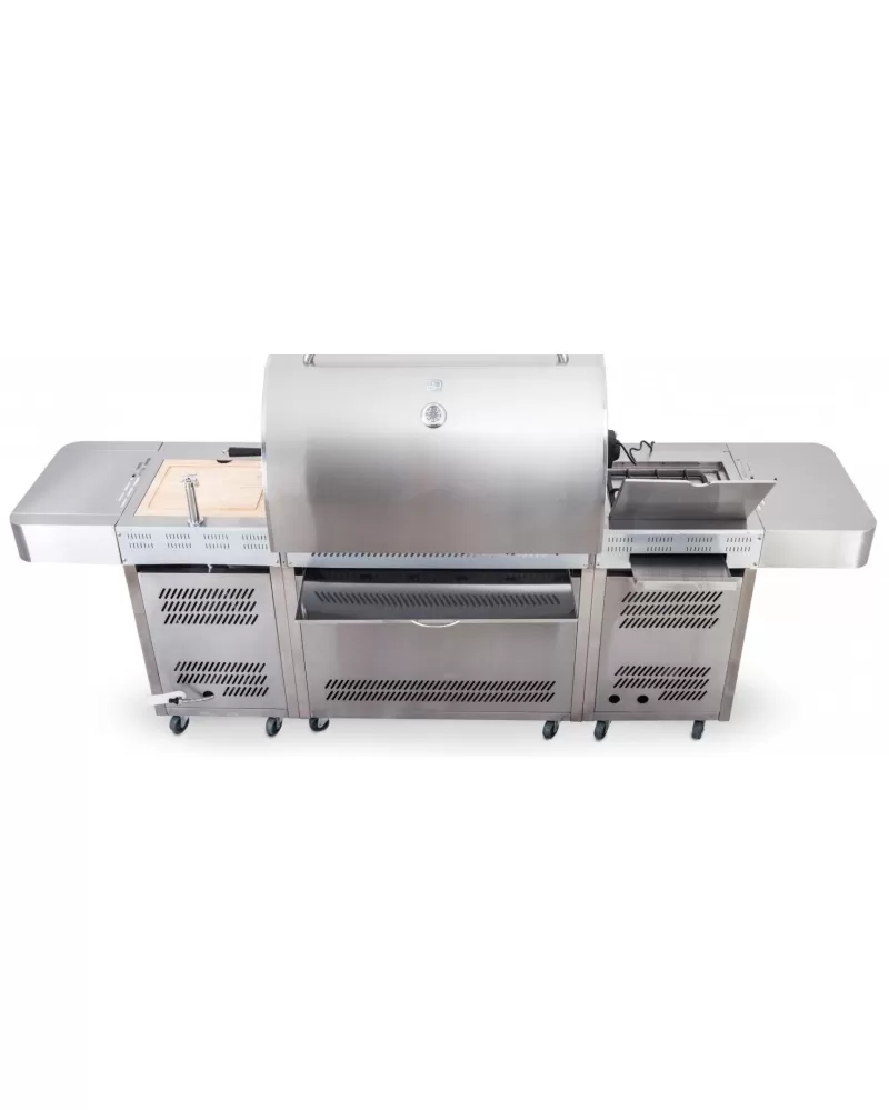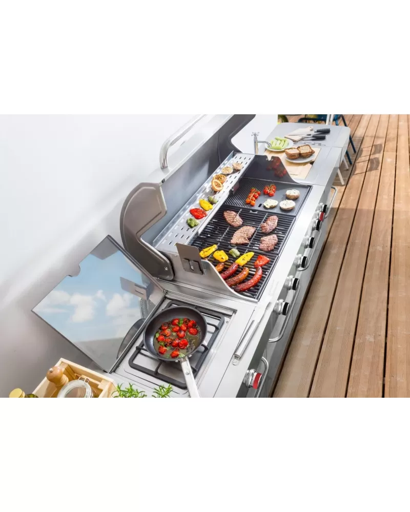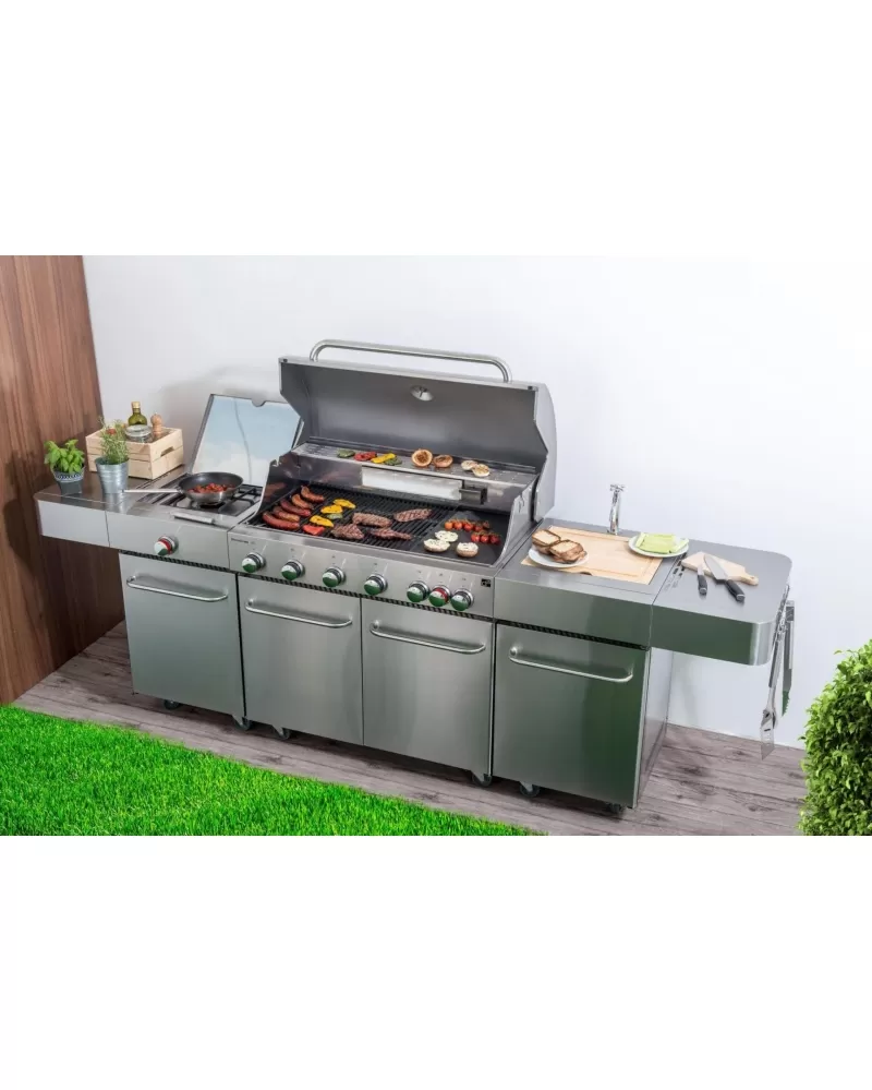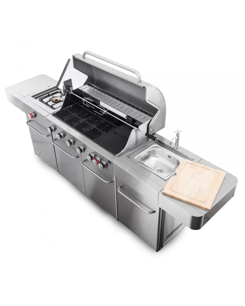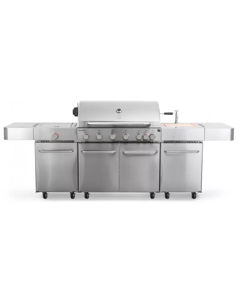 • Grilovací kuchyně Nevada má 7 hořáků, vestavěný dřez s víkem/krájecím prkénkem a velkou pracovní plochu, chytře řešené odkládací prostory, vestavěný teploměr ve víku, systém Flame Tamer a prodlouženou záruku.