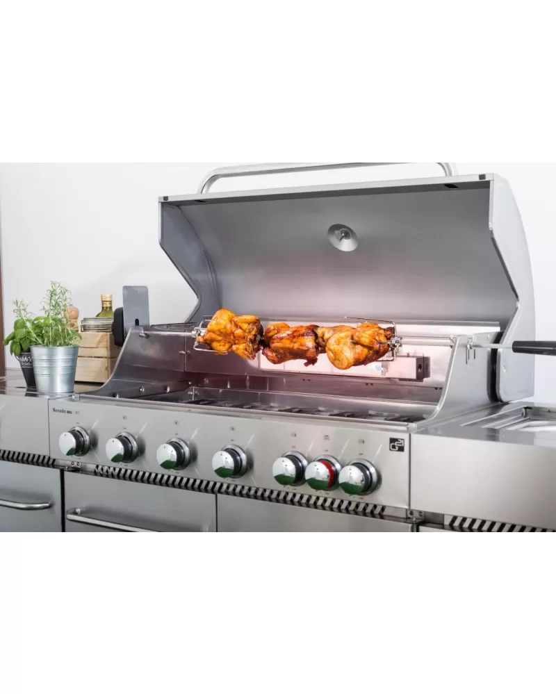 • Umístění hořáku zaručuje zdravou úpravu pokrmů a na hořáku se nepřipaluje ani tuk nebo šťávy. Na keramickém hořáku můžete ugrilovat vynikající steak nebo celé kuře. Hořák je totiž výborný i pro grilování na grilovací jehle.