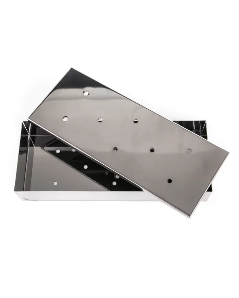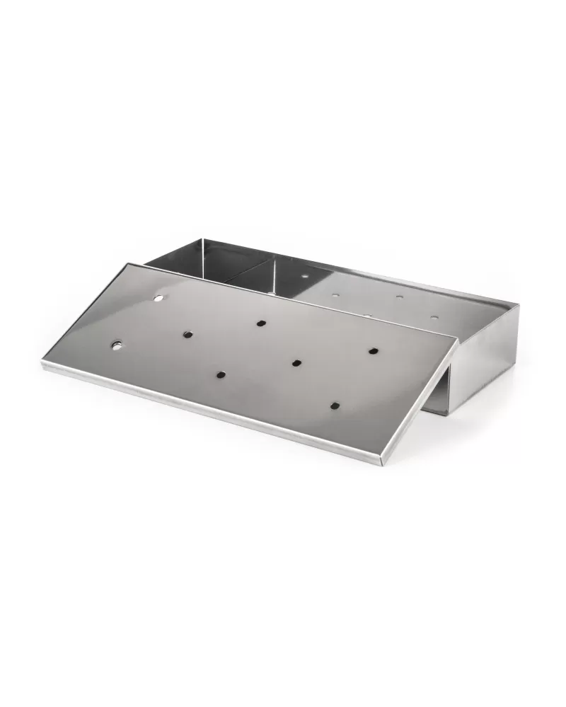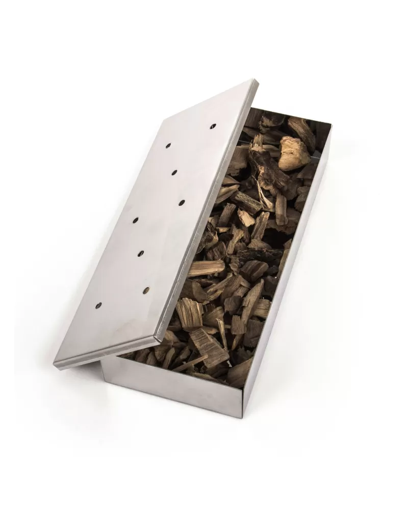 • Důmyslně řešená nerezová krabička s víkem se po naplnění dřevěnými lupínky nebo štěpkami zavře a vloží mezi hořáky plynového grilu, případně na rošt grilu na dřevěné uhlí nebo grilu elektrického.