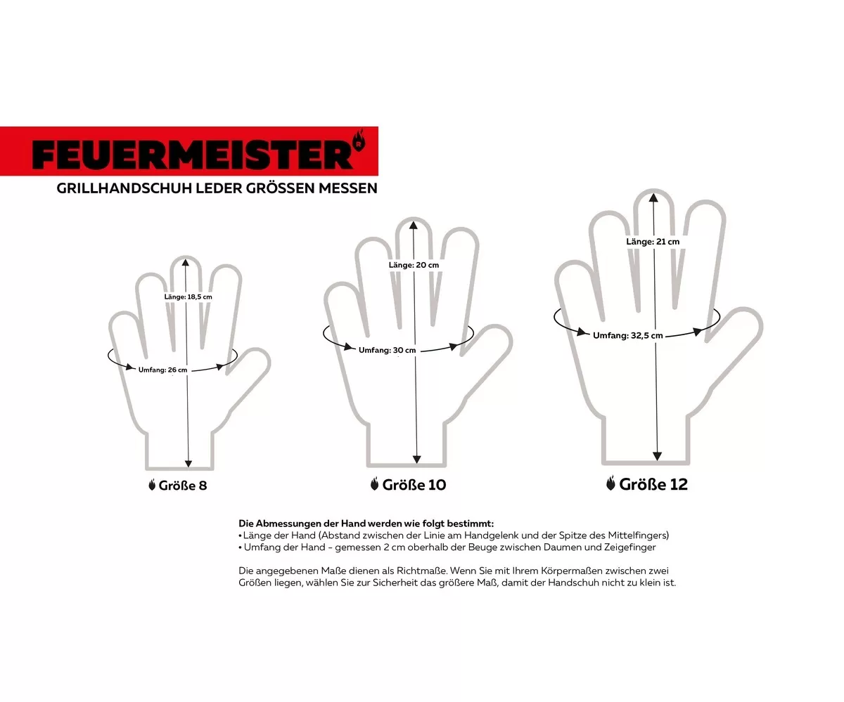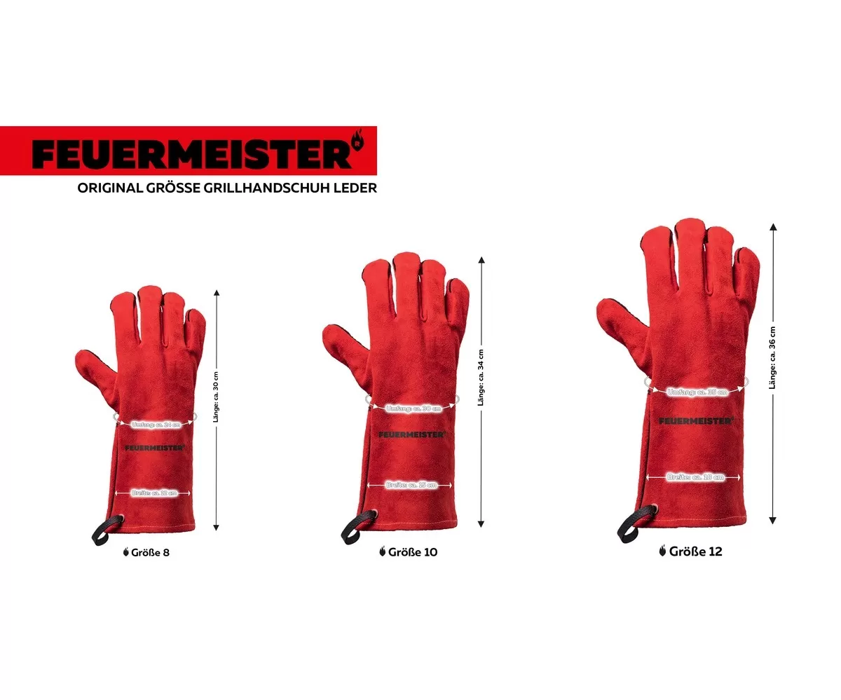 • Kožené grilovacie rukavice BBQ Premium (pár) predstavujú tradičný produkt v rade FEUERMEISTER®. Tepelne odolné rukavice sa vyznačujú kvalitným spracovaním a švami z tepelne odolnej a veľmi pevnej kevlarovej nite. Rukavice sú opatrené logom výrobcu FEUERMEISTER® ako pečaťou vysokej kvality. Rukavica je dostatočne dlhá, aby ochránila predlaktie pred teplom a odletujúcimi iskrami.