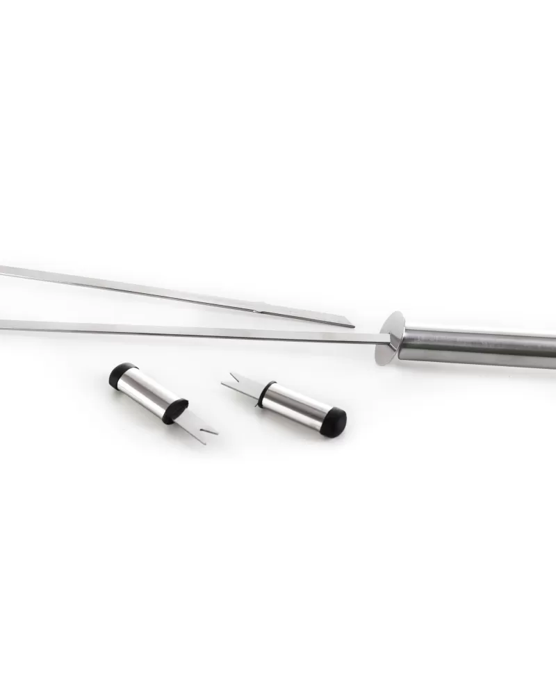 • Součástí sady je obracečka, vidlička, kleště, štětec na potírání, čistící kartáč, napichovátka pro snadné jedení klasů kukuřice a grilovací jehlice pro výrobu špízů.